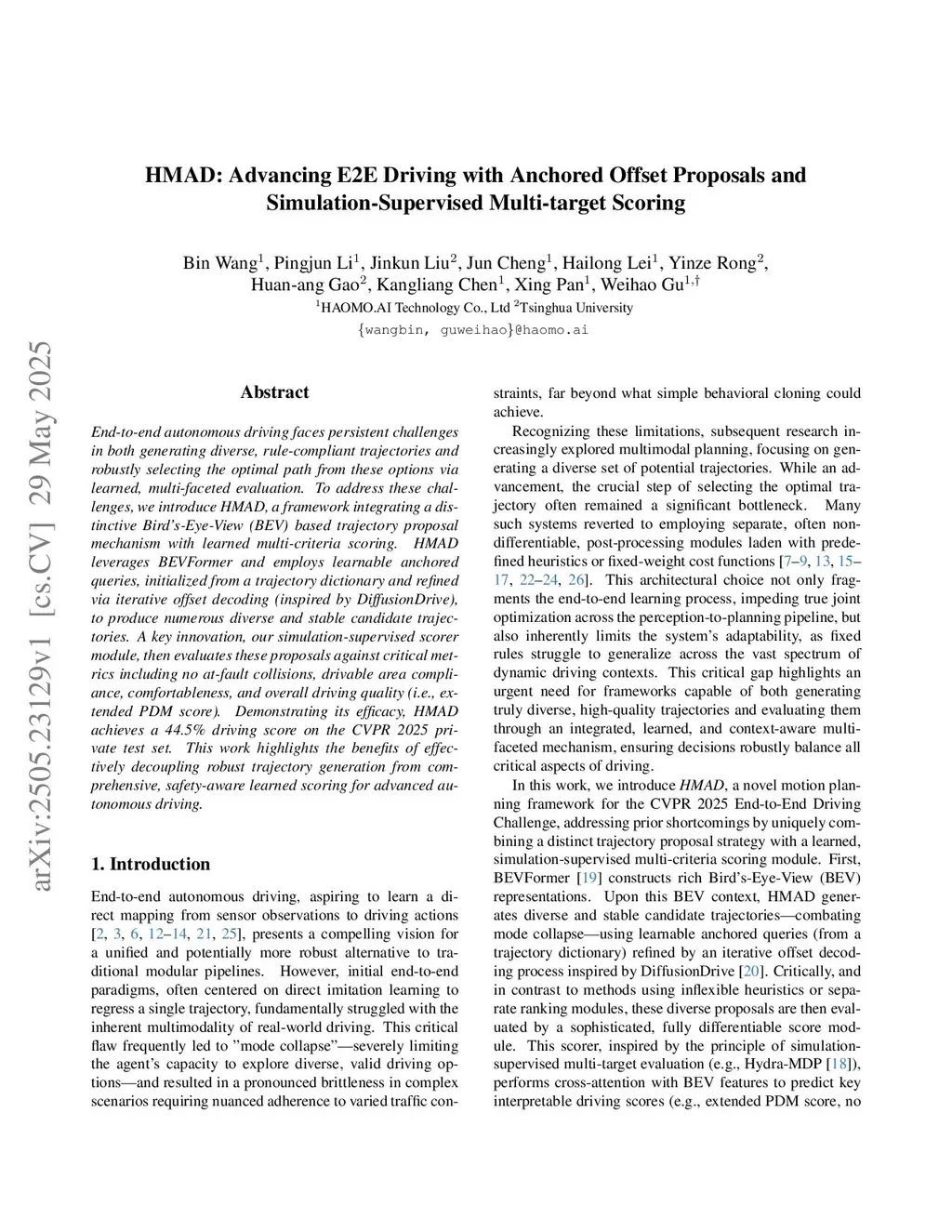 End-to-end autonomous driving faces persistent challenges in both generating diverse, rule-compliant trajectories and robustly selecting the optimal path from these options via learned, multi-faceted evaluation. To address these challenges, we introduce HMAD, a framework integrating a distinctive Bird's-Eye-View (BEV) based trajectory proposal mechanism with learned multi-criteria scoring. HMAD leverages BEVFormer and employs learnable anchored queries, initialized from a trajectory dictionary and refined via iterative offset decoding (inspired by DiffusionDrive), to produce numerous diverse and stable candidate trajectories. A key innovation, our simulation-supervised scorer module, then evaluates these proposals against critical metrics including no at-fault collisions, drivable area compliance, comfortableness, and overall driving quality (i.e., extended PDM score). Demonstrating its efficacy, HMAD achieves a 44.5% driving score on the CVPR 2025 private test set. This work highlights the benefits of effectively decoupling robust trajectory generation from comprehensive, safety-aware learned scoring for advanced autonomous driving.
