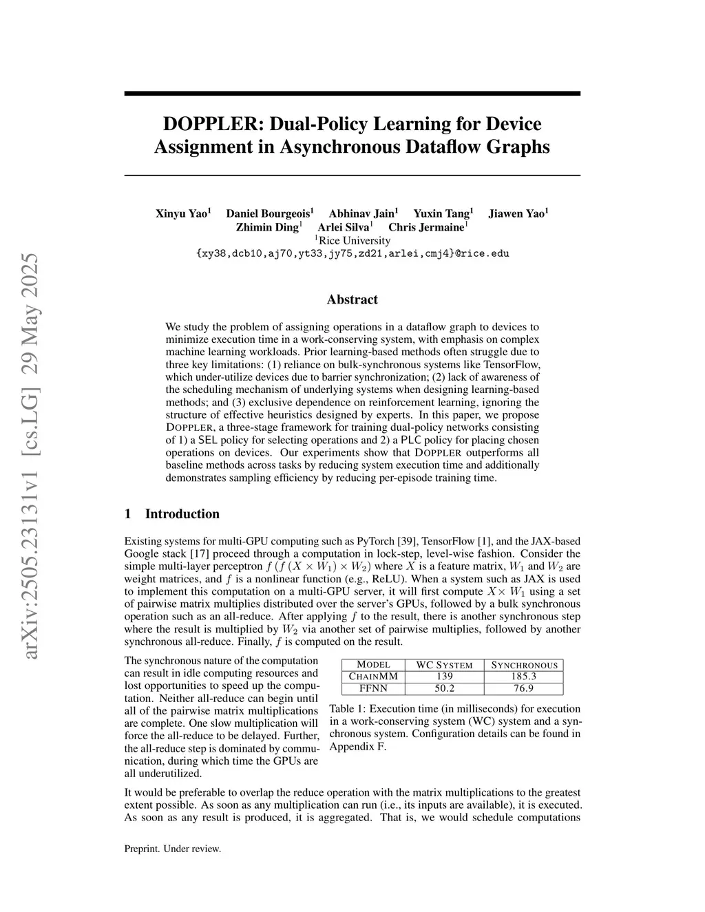 We study the problem of assigning operations in a dataflow graph to devices to minimize execution time in a work-conserving system, with emphasis on complex machine learning workloads. Prior learning-based methods often struggle due to three key limitations: (1) reliance on bulk-synchronous systems like TensorFlow, which under-utilize devices due to barrier synchronization; (2) lack of awareness of the scheduling mechanism of underlying systems when designing learning-based methods; and (3) exclusive dependence on reinforcement learning, ignoring the structure of effective heuristics designed by experts. In this paper, we propose \textsc{Doppler}, a three-stage framework for training dual-policy networks consisting of 1) a policy for selecting operations and 2) a policy for placing chosen operations on devices. Our experiments show that \textsc{Doppler} outperforms all baseline methods across tasks by reducing system execution time and additionally demonstrates sampling efficiency by reducing per-episode training time.