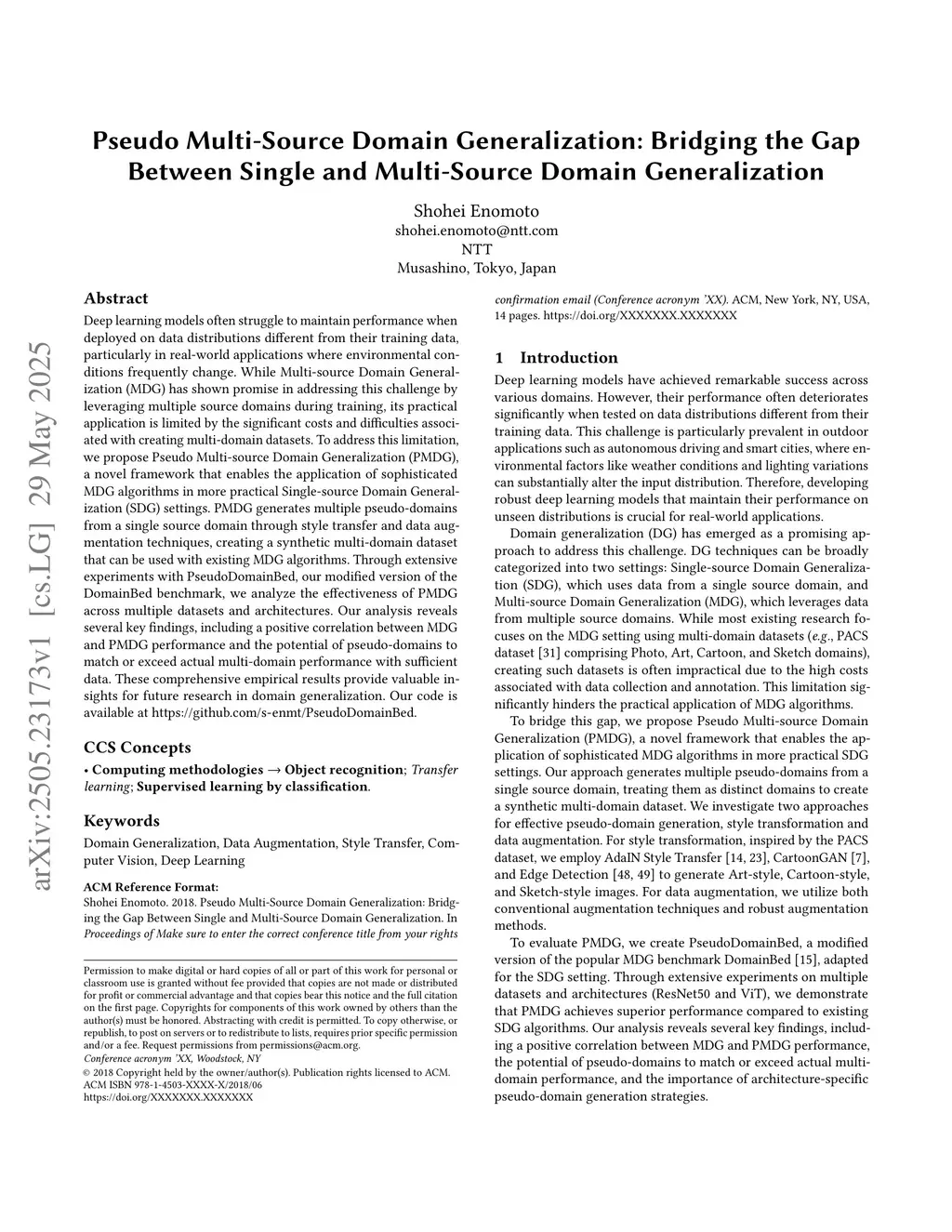 Deep learning models often struggle to maintain performance when deployed on data distributions different from their training data, particularly in real-world applications where environmental conditions frequently change. While Multi-source Domain Generalization (MDG) has shown promise in addressing this challenge by leveraging multiple source domains during training, its practical application is limited by the significant costs and difficulties associated with creating multi-domain datasets. To address this limitation, we propose Pseudo Multi-source Domain Generalization (PMDG), a novel framework that enables the application of sophisticated MDG algorithms in more practical Single-source Domain Generalization (SDG) settings. PMDG generates multiple pseudo-domains from a single source domain through style transfer and data augmentation techniques, creating a synthetic multi-domain dataset that can be used with existing MDG algorithms. Through extensive experiments with PseudoDomainBed, our modified version of the DomainBed benchmark, we analyze the effectiveness of PMDG across multiple datasets and architectures. Our analysis reveals several key findings, including a positive correlation between MDG and PMDG performance and the potential of pseudo-domains to match or exceed actual multi-domain performance with sufficient data. These comprehensive empirical results provide valuable insights for future research in domain generalization. Our code is available atthis https URL.