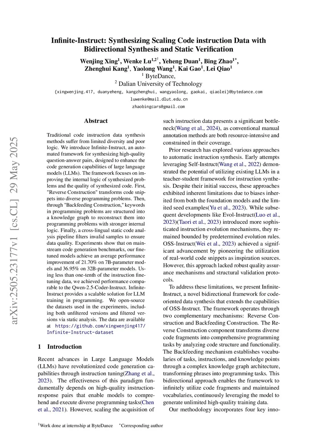 Traditional code instruction data synthesis methods suffer from limited diversity and poor logic. We introduce Infinite-Instruct, an automated framework for synthesizing high-quality question-answer pairs, designed to enhance the code generation capabilities of large language models (LLMs). The framework focuses on improving the internal logic of synthesized problems and the quality of synthesized code. First, "Reverse Construction" transforms code snippets into diverse programming problems. Then, through "Backfeeding Construction," keywords in programming problems are structured into a knowledge graph to reconstruct them into programming problems with stronger internal logic. Finally, a cross-lingual static code analysis pipeline filters invalid samples to ensure data quality. Experiments show that on mainstream code generation benchmarks, our fine-tuned models achieve an average performance improvement of 21.70% on 7B-parameter models and 36.95% on 32B-parameter models. Using less than one-tenth of the instruction fine-tuning data, we achieved performance comparable to the Qwen-2.5-Coder-Instruct. Infinite-Instruct provides a scalable solution for LLM training in programming. We open-source the datasets used in the experiments, including both unfiltered versions and filtered versions via static analysis. The data are available atthis https URL
