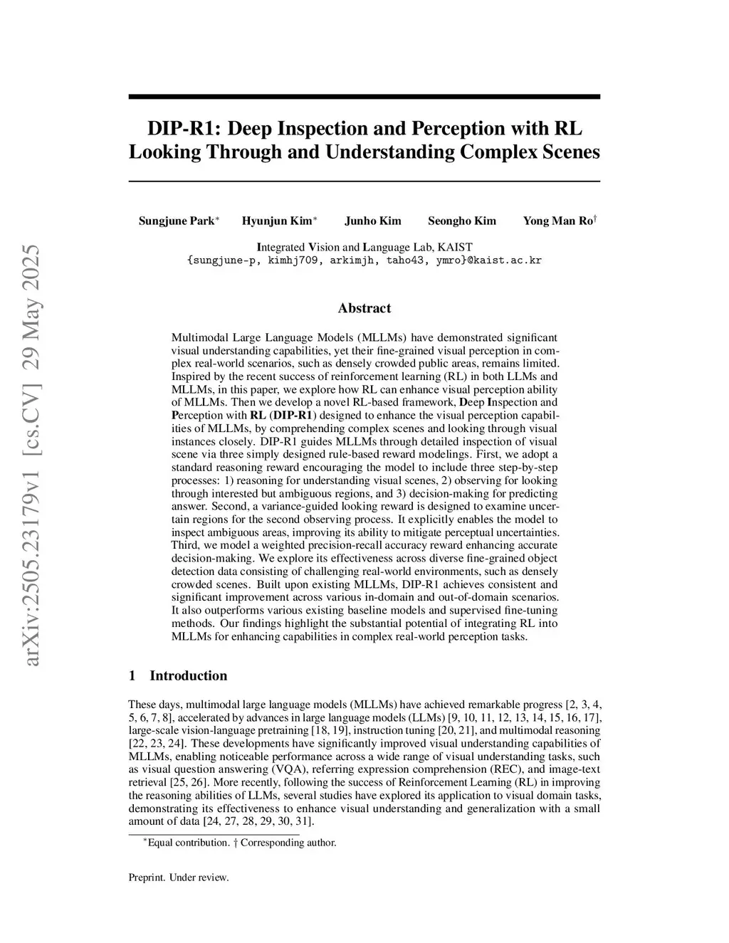 Multimodal Large Language Models (MLLMs) have demonstrated significant visual understanding capabilities, yet their fine-grained visual perception in complex real-world scenarios, such as densely crowded public areas, remains limited. Inspired by the recent success of reinforcement learning (RL) in both LLMs and MLLMs, in this paper, we explore how RL can enhance visual perception ability of MLLMs. Then we develop a novel RL-based framework, Deep Inspection and Perception with RL (DIP-R1) designed to enhance the visual perception capabilities of MLLMs, by comprehending complex scenes and looking through visual instances closely. DIP-R1 guides MLLMs through detailed inspection of visual scene via three simply designed rule-based reward modelings. First, we adopt a standard reasoning reward encouraging the model to include three step-by-step processes: 1) reasoning for understanding visual scenes, 2) observing for looking through interested but ambiguous regions, and 3) decision-making for predicting answer. Second, a variance-guided looking reward is designed to examine uncertain regions for the second observing process. It explicitly enables the model to inspect ambiguous areas, improving its ability to mitigate perceptual uncertainties. Third, we model a weighted precision-recall accuracy reward enhancing accurate decision-making. We explore its effectiveness across diverse fine-grained object detection data consisting of challenging real-world environments, such as densely crowded scenes. Built upon existing MLLMs, DIP-R1 achieves consistent and significant improvement across various in-domain and out-of-domain scenarios. It also outperforms various existing baseline models and supervised fine-tuning methods. Our findings highlight the substantial potential of integrating RL into MLLMs for enhancing capabilities in complex real-world perception tasks.