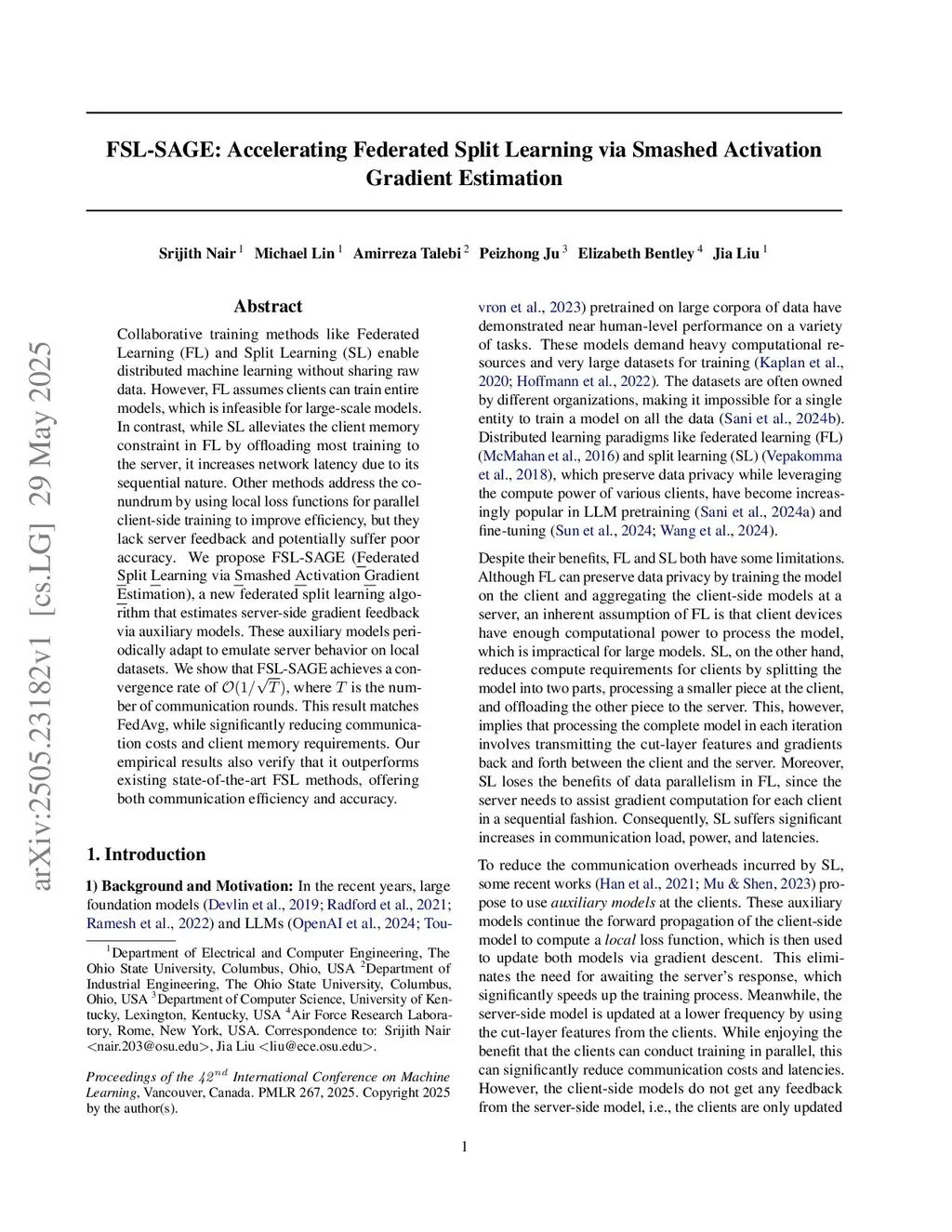 Collaborative training methods like Federated Learning (FL) and Split Learning (SL) enable distributed machine learning without sharing raw data. However, FL assumes clients can train entire models, which is infeasible for large-scale models. In contrast, while SL alleviates the client memory constraint in FL by offloading most training to the server, it increases network latency due to its sequential nature. Other methods address the conundrum by using local loss functions for parallel client-side training to improve efficiency, but they lack server feedback and potentially suffer poor accuracy. We propose FSL-SAGE (Federated Split Learning via Smashed Activation Gradient Estimation), a new federated split learning algorithm that estimates server-side gradient feedback via auxiliary models. These auxiliary models periodically adapt to emulate server behavior on local datasets. We show that FSL-SAGE achieves a convergence rate of , where is the number of communication rounds. This result matches FedAvg, while significantly reducing communication costs and client memory requirements. Our empirical results also verify that it outperforms existing state-of-the-art FSL methods, offering both communication efficiency and accuracy.