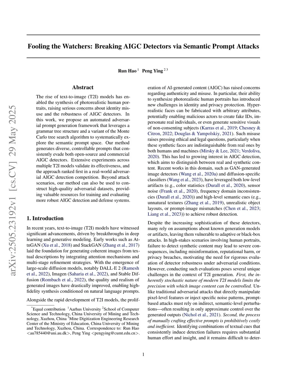 The rise of text-to-image (T2I) models has enabled the synthesis of photorealistic human portraits, raising serious concerns about identity misuse and the robustness of AIGC detectors. In this work, we propose an automated adversarial prompt generation framework that leverages a grammar tree structure and a variant of the Monte Carlo tree search algorithm to systematically explore the semantic prompt space. Our method generates diverse, controllable prompts that consistently evade both open-source and commercial AIGC detectors. Extensive experiments across multiple T2I models validate its effectiveness, and the approach ranked first in a real-world adversarial AIGC detection competition. Beyond attack scenarios, our method can also be used to construct high-quality adversarial datasets, providing valuable resources for training and evaluating more robust AIGC detection and defense systems.