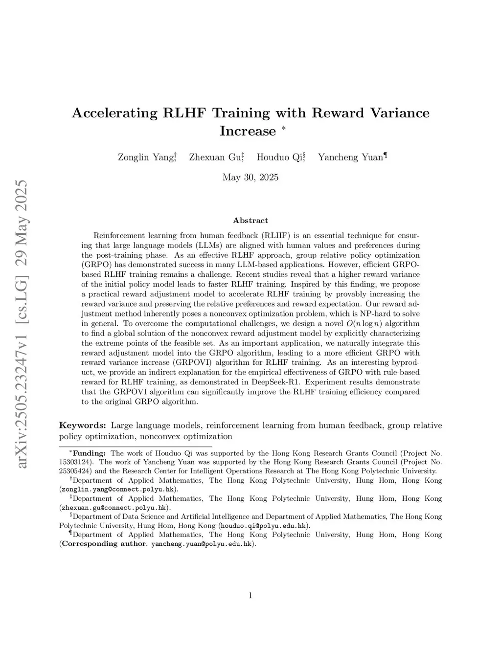 Reinforcement learning from human feedback (RLHF) is an essential technique for ensuring that large language models (LLMs) are aligned with human values and preferences during the post-training phase. As an effective RLHF approach, group relative policy optimization (GRPO) has demonstrated success in many LLM-based applications. However, efficient GRPO-based RLHF training remains a challenge. Recent studies reveal that a higher reward variance of the initial policy model leads to faster RLHF training. Inspired by this finding, we propose a practical reward adjustment model to accelerate RLHF training by provably increasing the reward variance and preserving the relative preferences and reward expectation. Our reward adjustment method inherently poses a nonconvex optimization problem, which is NP-hard to solve in general. To overcome the computational challenges, we design a novel algorithm to find a global solution of the nonconvex reward adjustment model by explicitly characterizing the extreme points of the feasible set. As an important application, we naturally integrate this reward adjustment model into the GRPO algorithm, leading to a more efficient GRPO with reward variance increase (GRPOVI) algorithm for RLHF training. As an interesting byproduct, we provide an indirect explanation for the empirical effectiveness of GRPO with rule-based reward for RLHF training, as demonstrated in DeepSeek-R1. Experiment results demonstrate that the GRPOVI algorithm can significantly improve the RLHF training efficiency compared to the original GRPO algorithm.