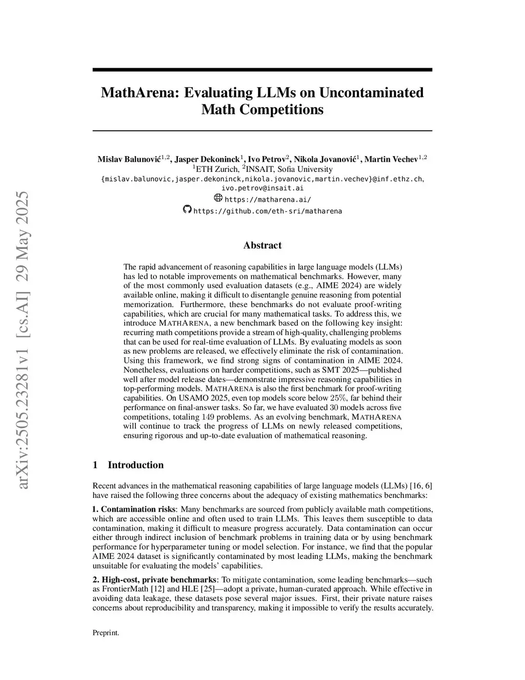 The rapid advancement of reasoning capabilities in large language models (LLMs) has led to notable improvements on mathematical benchmarks. However, many of the most commonly used evaluation datasets (e.g., AIME 2024) are widely available online, making it difficult to disentangle genuine reasoning from potential memorization. Furthermore, these benchmarks do not evaluate proof-writing capabilities, which are crucial for many mathematical tasks. To address this, we introduce MathArena, a new benchmark based on the following key insight: recurring math competitions provide a stream of high-quality, challenging problems that can be used for real-time evaluation of LLMs. By evaluating models as soon as new problems are released, we effectively eliminate the risk of contamination. Using this framework, we find strong signs of contamination in AIME 2024. Nonetheless, evaluations on harder competitions, such as CMIMC 2025, demonstrate impressive reasoning capabilities in top-performing models. MathArena is also the first benchmark for proof-writing capabilities. On IMO 2025, top models achieve slightly less than 40%, demonstrating both notable progress and significant room for improvement. So far, we have evaluated over models across seven competitions, totaling problems. As an evolving benchmark, MathArena will continue to track the progress of LLMs on newly released competitions, ensuring rigorous and up-to-date evaluation of mathematical reasoning.