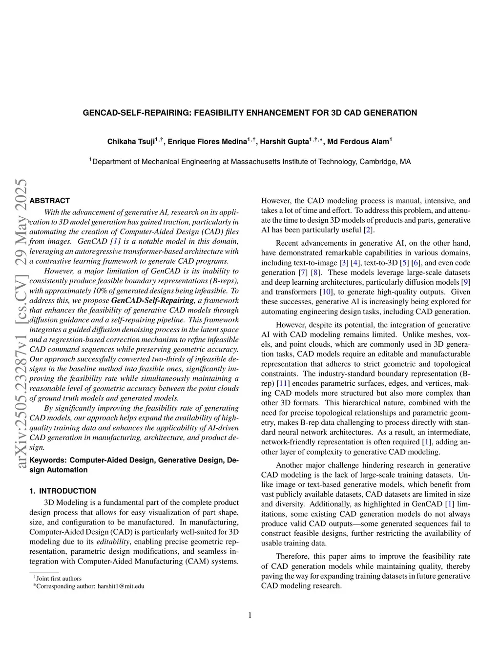 With the advancement of generative AI, research on its application to 3D model generation has gained traction, particularly in automating the creation of Computer-Aided Design (CAD) files from images. GenCAD is a notable model in this domain, leveraging an autoregressive transformer-based architecture with a contrastive learning framework to generate CAD programs.However, a major limitation of GenCAD is its inability to consistently produce feasible boundary representations (B-reps), with approximately 10% of generated designs being infeasible. To address this, we propose GenCAD-Self-Repairing, a framework that enhances the feasibility of generative CAD models through diffusion guidance and a self-repairing pipeline. This framework integrates a guided diffusion denoising process in the latent space and a regression-based correction mechanism to refine infeasible CAD command sequences while preserving geometric accuracy. Our approach successfully converted two-thirds of infeasible designs in the baseline method into feasible ones, significantly improving the feasibility rate while simultaneously maintaining a reasonable level of geometric accuracy between the point clouds of ground truth models and generated models.By significantly improving the feasibility rate of generating CAD models, our approach helps expand the availability of high-quality training data and enhances the applicability of AI-driven CAD generation in manufacturing, architecture, and product design.