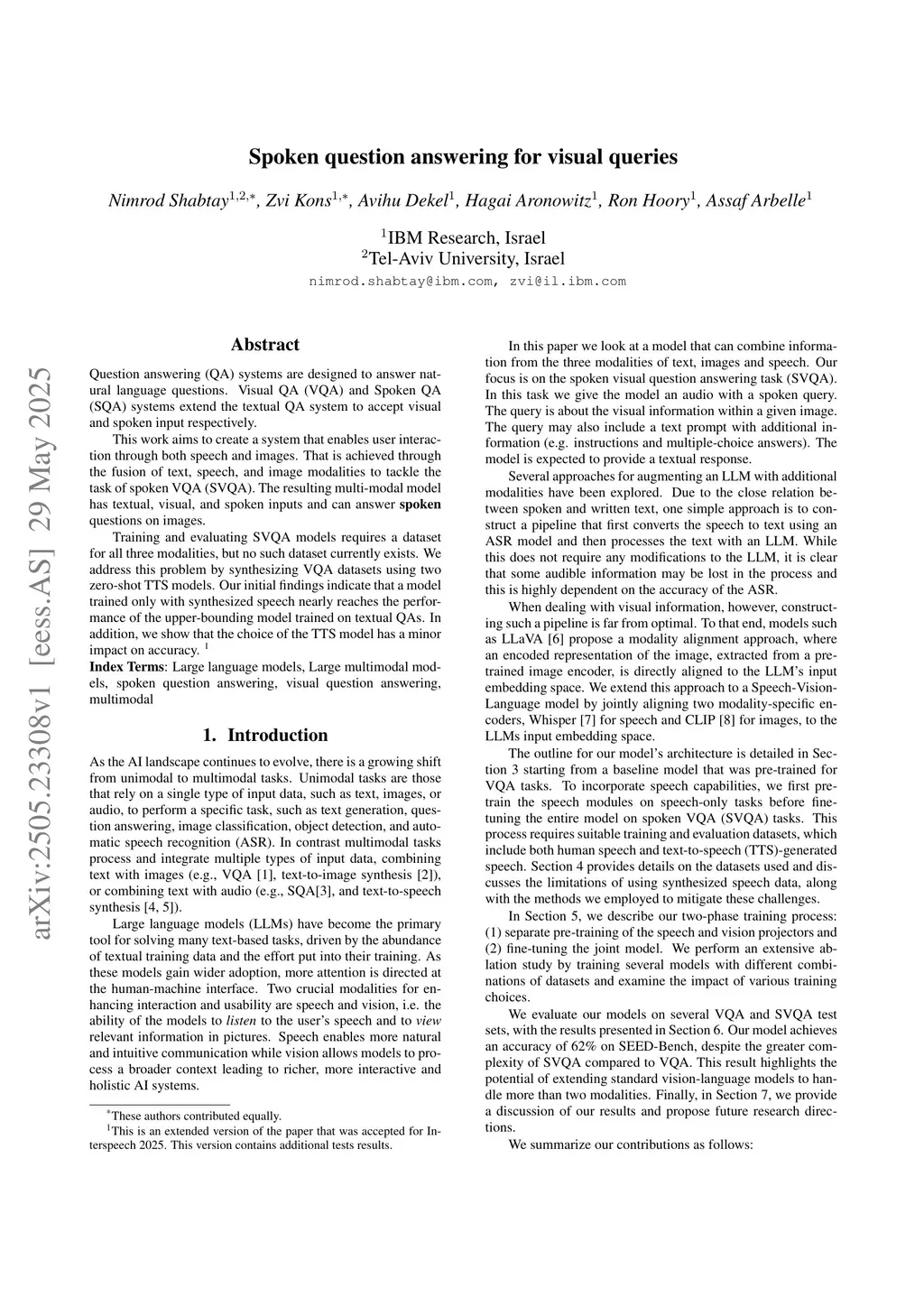 Question answering (QA) systems are designed to answer natural language questions. Visual QA (VQA) and Spoken QA (SQA) systems extend the textual QA system to accept visual and spoken input respectively.This work aims to create a system that enables user interaction through both speech and images. That is achieved through the fusion of text, speech, and image modalities to tackle the task of spoken VQA (SVQA). The resulting multi-modal model has textual, visual, and spoken inputs and can answer spoken questions on images.Training and evaluating SVQA models requires a dataset for all three modalities, but no such dataset currently exists. We address this problem by synthesizing VQA datasets using two zero-shot TTS models. Our initial findings indicate that a model trained only with synthesized speech nearly reaches the performance of the upper-bounding model trained on textual QAs. In addition, we show that the choice of the TTS model has a minor impact on accuracy.