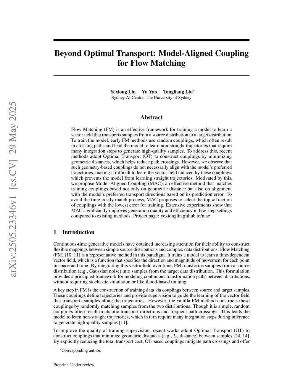 Flow Matching (FM) is an effective framework for training a model to learn a vector field that transports samples from a source distribution to a target distribution. To train the model, early FM methods use random couplings, which often result in crossing paths and lead the model to learn non-straight trajectories that require many integration steps to generate high-quality samples. To address this, recent methods adopt Optimal Transport (OT) to construct couplings by minimizing geometric distances, which helps reduce path crossings. However, we observe that such geometry-based couplings do not necessarily align with the model's preferred trajectories, making it difficult to learn the vector field induced by these couplings, which prevents the model from learning straight trajectories. Motivated by this, we propose Model-Aligned Coupling (MAC), an effective method that matches training couplings based not only on geometric distance but also on alignment with the model's preferred transport directions based on its prediction error. To avoid the time-costly match process, MAC proposes to select the top- fraction of couplings with the lowest error for training. Extensive experiments show that MAC significantly improves generation quality and efficiency in few-step settings compared to existing methods. Project page:this https URL