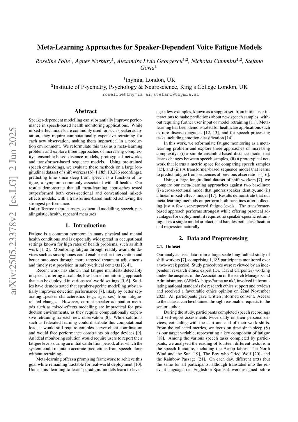 Speaker-dependent modelling can substantially improve performance in speech-based health monitoring applications. While mixed-effect models are commonly used for such speaker adaptation, they require computationally expensive retraining for each new observation, making them impractical in a production environment. We reformulate this task as a meta-learning problem and explore three approaches of increasing complexity: ensemble-based distance models, prototypical networks, and transformer-based sequence models. Using pre-trained speech embeddings, we evaluate these methods on a large longitudinal dataset of shift workers (N=1,185, 10,286 recordings), predicting time since sleep from speech as a function of fatigue, a symptom commonly associated with ill-health. Our results demonstrate that all meta-learning approaches tested outperformed both cross-sectional and conventional mixed-effects models, with a transformer-based method achieving the strongest performance.