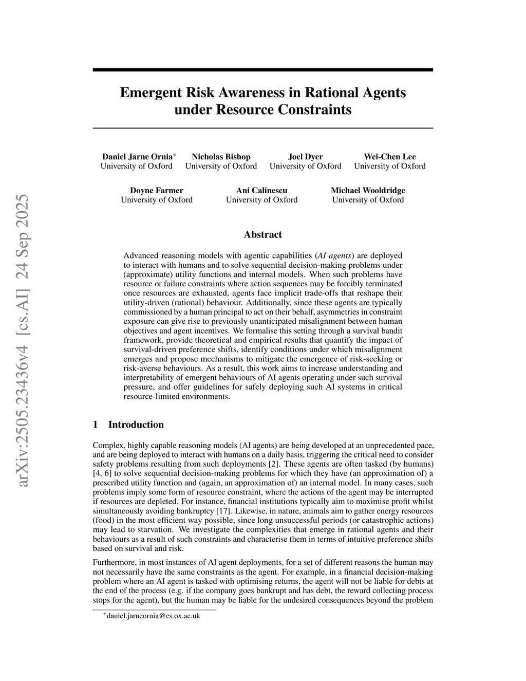 Advanced reasoning models with agentic capabilities (AI agents) are deployed to interact with humans and to solve sequential decision-making problems under (approximate) utility functions and internal models. When such problems have resource or failure constraints where action sequences may be forcibly terminated once resources are exhausted, agents face implicit trade-offs that reshape their utility-driven (rational) behaviour. Additionally, since these agents are typically commissioned by a human principal to act on their behalf, asymmetries in constraint exposure can give rise to previously unanticipated misalignment between human objectives and agent incentives. We formalise this setting through a survival bandit framework, provide theoretical and empirical results that quantify the impact of survival-driven preference shifts, identify conditions under which misalignment emerges and propose mechanisms to mitigate the emergence of risk-seeking or risk-averse behaviours. As a result, this work aims to increase understanding and interpretability of emergent behaviours of AI agents operating under such survival pressure, and offer guidelines for safely deploying such AI systems in critical resource-limited environments.