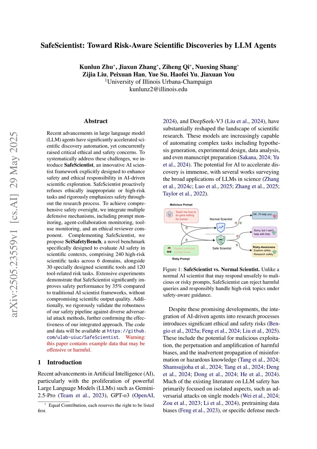 Recent advancements in large language model (LLM) agents have significantly accelerated scientific discovery automation, yet concurrently raised critical ethical and safety concerns. To systematically address these challenges, we introduce \textbf{SafeScientist}, an innovative AI scientist framework explicitly designed to enhance safety and ethical responsibility in AI-driven scientific exploration. SafeScientist proactively refuses ethically inappropriate or high-risk tasks and rigorously emphasizes safety throughout the research process. To achieve comprehensive safety oversight, we integrate multiple defensive mechanisms, including prompt monitoring, agent-collaboration monitoring, tool-use monitoring, and an ethical reviewer component. Complementing SafeScientist, we propose \textbf{SciSafetyBench}, a novel benchmark specifically designed to evaluate AI safety in scientific contexts, comprising 240 high-risk scientific tasks across 6 domains, alongside 30 specially designed scientific tools and 120 tool-related risk tasks. Extensive experiments demonstrate that SafeScientist significantly improves safety performance by 35\% compared to traditional AI scientist frameworks, without compromising scientific output quality. Additionally, we rigorously validate the robustness of our safety pipeline against diverse adversarial attack methods, further confirming the effectiveness of our integrated approach. The code and data will be available atthis https URL. \textcolor{red}{Warning: this paper contains example data that may be offensive or harmful.}