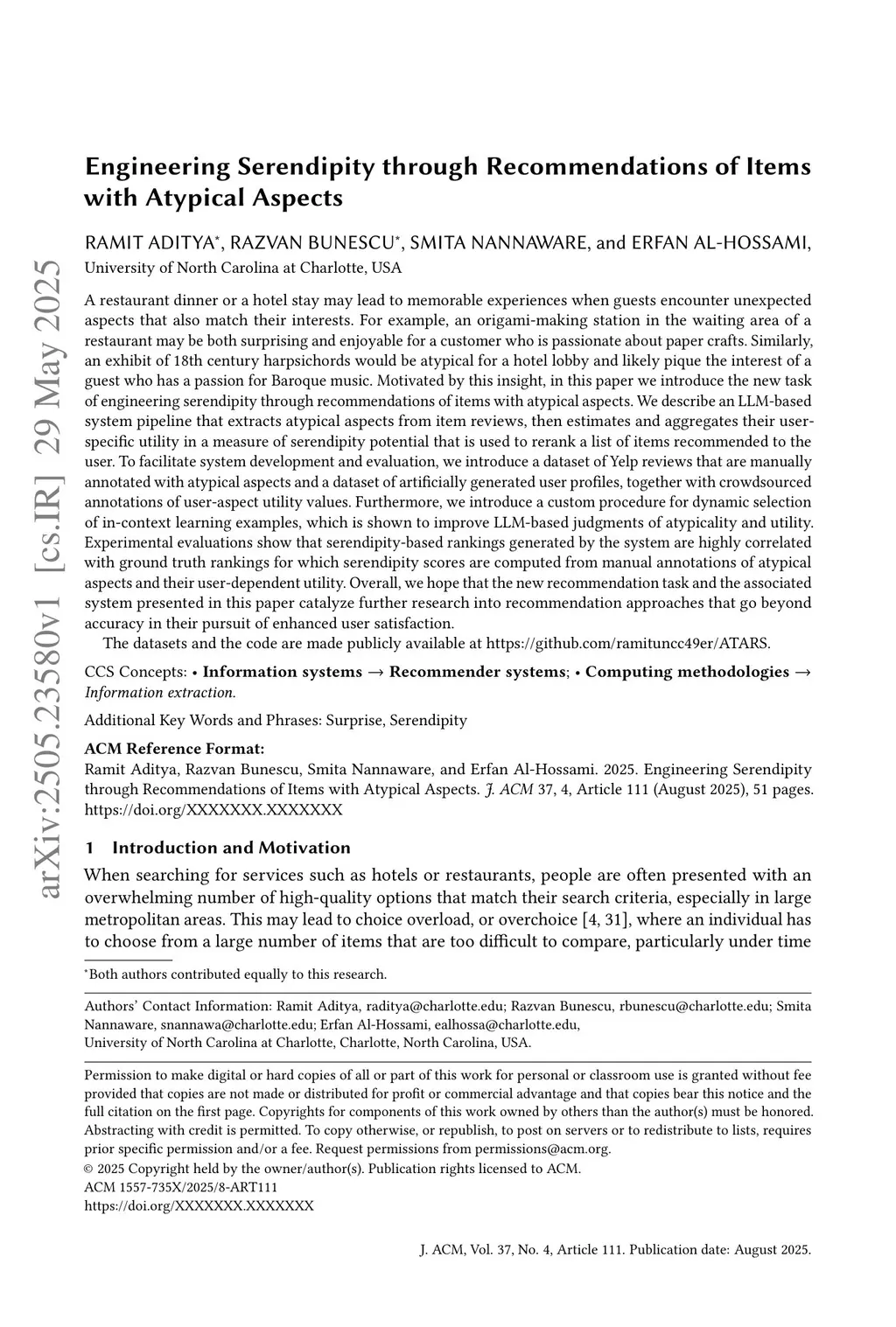 A restaurant dinner or a hotel stay may lead to memorable experiences when guests encounter unexpected aspects that also match their interests. For example, an origami-making station in the waiting area of a restaurant may be both surprising and enjoyable for a customer who is passionate about paper crafts. Similarly, an exhibit of 18th century harpsichords would be atypical for a hotel lobby and likely pique the interest of a guest who has a passion for Baroque music. Motivated by this insight, in this paper we introduce the new task of engineering serendipity through recommendations of items with atypical aspects. We describe an LLM-based system pipeline that extracts atypical aspects from item reviews, then estimates and aggregates their user-specific utility in a measure of serendipity potential that is used to rerank a list of items recommended to the user. To facilitate system development and evaluation, we introduce a dataset of Yelp reviews that are manually annotated with atypical aspects and a dataset of artificially generated user profiles, together with crowdsourced annotations of user-aspect utility values. Furthermore, we introduce a custom procedure for dynamic selection of in-context learning examples, which is shown to improve LLM-based judgments of atypicality and utility. Experimental evaluations show that serendipity-based rankings generated by the system are highly correlated with ground truth rankings for which serendipity scores are computed from manual annotations of atypical aspects and their user-dependent utility. Overall, we hope that the new recommendation task and the associated system presented in this paper catalyze further research into recommendation approaches that go beyond accuracy in their pursuit of enhanced user satisfaction.The datasets and the code are made publicly available atthis https URL.