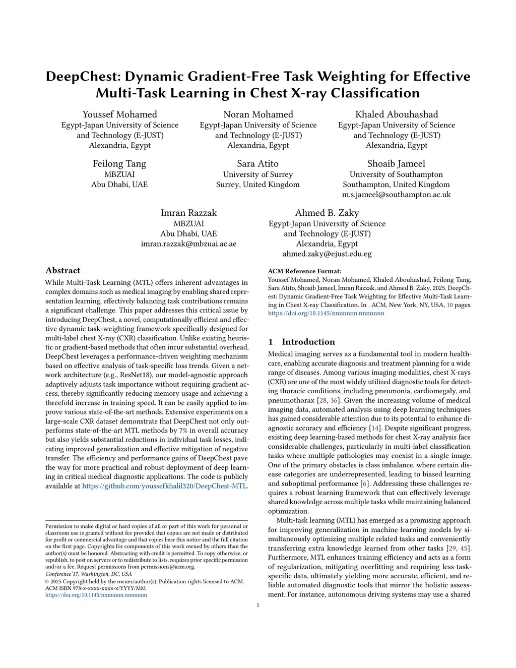 While Multi-Task Learning (MTL) offers inherent advantages in complex domains such as medical imaging by enabling shared representation learning, effectively balancing task contributions remains a significant challenge. This paper addresses this critical issue by introducing DeepChest, a novel, computationally efficient and effective dynamic task-weighting framework specifically designed for multi-label chest X-ray (CXR) classification. Unlike existing heuristic or gradient-based methods that often incur substantial overhead, DeepChest leverages a performance-driven weighting mechanism based on effective analysis of task-specific loss trends. Given a network architecture (e.g., ResNet18), our model-agnostic approach adaptively adjusts task importance without requiring gradient access, thereby significantly reducing memory usage and achieving a threefold increase in training speed. It can be easily applied to improve various state-of-the-art methods. Extensive experiments on a large-scale CXR dataset demonstrate that DeepChest not only outperforms state-of-the-art MTL methods by 7% in overall accuracy but also yields substantial reductions in individual task losses, indicating improved generalization and effective mitigation of negative transfer. The efficiency and performance gains of DeepChest pave the way for more practical and robust deployment of deep learning in critical medical diagnostic applications. The code is publicly available atthis https URL