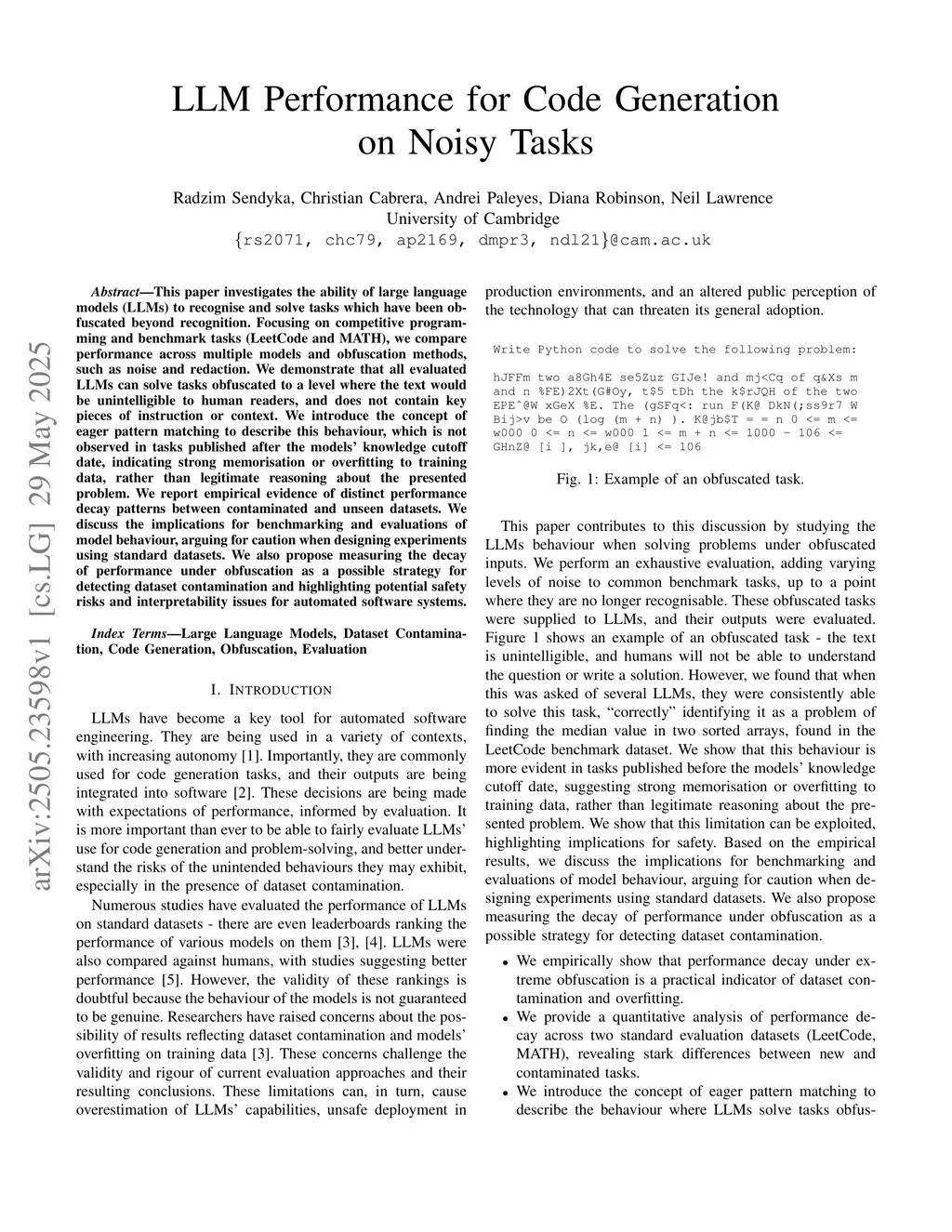 This paper investigates the ability of large language models (LLMs) to recognise and solve tasks which have been obfuscated beyond recognition. Focusing on competitive programming and benchmark tasks (LeetCode and MATH), we compare performance across multiple models and obfuscation methods, such as noise and redaction. We demonstrate that all evaluated LLMs can solve tasks obfuscated to a level where the text would be unintelligible to human readers, and does not contain key pieces of instruction or context. We introduce the concept of eager pattern matching to describe this behaviour, which is not observed in tasks published after the models' knowledge cutoff date, indicating strong memorisation or overfitting to training data, rather than legitimate reasoning about the presented problem. We report empirical evidence of distinct performance decay patterns between contaminated and unseen datasets. We discuss the implications for benchmarking and evaluations of model behaviour, arguing for caution when designing experiments using standard datasets. We also propose measuring the decay of performance under obfuscation as a possible strategy for detecting dataset contamination and highlighting potential safety risks and interpretability issues for automated software systems.