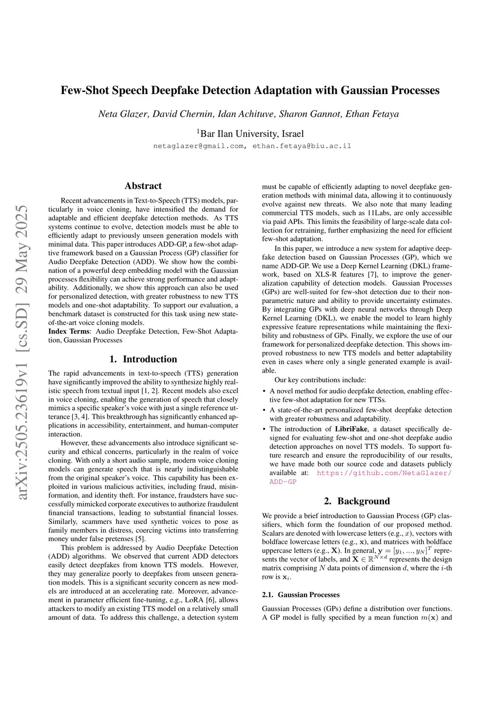 Recent advancements in Text-to-Speech (TTS) models, particularly in voice cloning, have intensified the demand for adaptable and efficient deepfake detection methods. As TTS systems continue to evolve, detection models must be able to efficiently adapt to previously unseen generation models with minimal data. This paper introduces ADD-GP, a few-shot adaptive framework based on a Gaussian Process (GP) classifier for Audio Deepfake Detection (ADD). We show how the combination of a powerful deep embedding model with the Gaussian processes flexibility can achieve strong performance and adaptability. Additionally, we show this approach can also be used for personalized detection, with greater robustness to new TTS models and one-shot adaptability. To support our evaluation, a benchmark dataset is constructed for this task using new state-of-the-art voice cloning models.