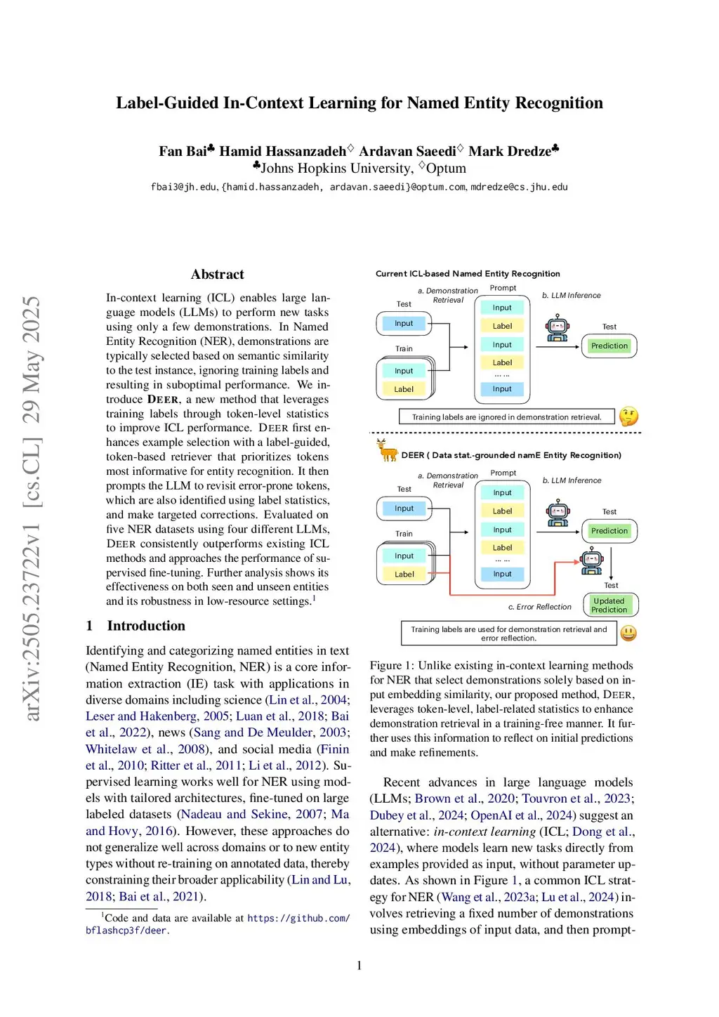In-context learning (ICL) enables large language models (LLMs) to perform new tasks using only a few demonstrations. However, in Named Entity Recognition (NER), existing ICL methods typically rely on task-agnostic semantic similarity for demonstration retrieval, which often yields less relevant examples and leads to inferior results. We introduce DEER, a training-free ICL approach that enables LLMs to make more informed entity predictions through the use of label-grounded statistics. DEER leverages token-level statistics from training labels to identify tokens most informative for entity recognition, enabling entity-focused demonstrations. It further uses these statistics to detect and refine error-prone tokens through a targeted reflection step. Evaluated on five NER datasets across four LLMs, DEER consistently outperforms existing ICL methods and achieves performance comparable to supervised fine-tuning. Further analyses demonstrate that DEER improves example retrieval, remains effective on both seen and unseen entities, and exhibits strong robustness in low-resource settings.