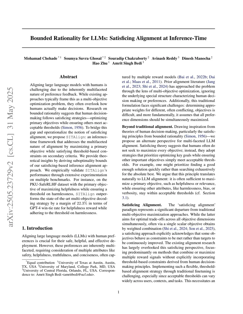 Aligning large language models with humans is challenging due to the inherently multifaceted nature of preference feedback. While existing approaches typically frame this as a multi-objective optimization problem, they often overlook how humans actually make decisions. Research on bounded rationality suggests that human decision making follows satisficing strategies-optimizing primary objectives while ensuring others meet acceptable thresholds. To bridge this gap and operationalize the notion of satisficing alignment, we propose SITAlign: an inference time framework that addresses the multifaceted nature of alignment by maximizing a primary objective while satisfying threshold-based constraints on secondary criteria. We provide theoretical insights by deriving sub-optimality bounds of our satisficing based inference alignment approach. We empirically validate SITAlign's performance through extensive experimentation on multiple benchmarks. For instance, on the PKU-SafeRLHF dataset with the primary objective of maximizing helpfulness while ensuring a threshold on harmlessness, SITAlign outperforms the state-of-the-art multi objective decoding strategy by a margin of 22.3% in terms of GPT-4 win-tie rate for helpfulness reward while adhering to the threshold on harmlessness.