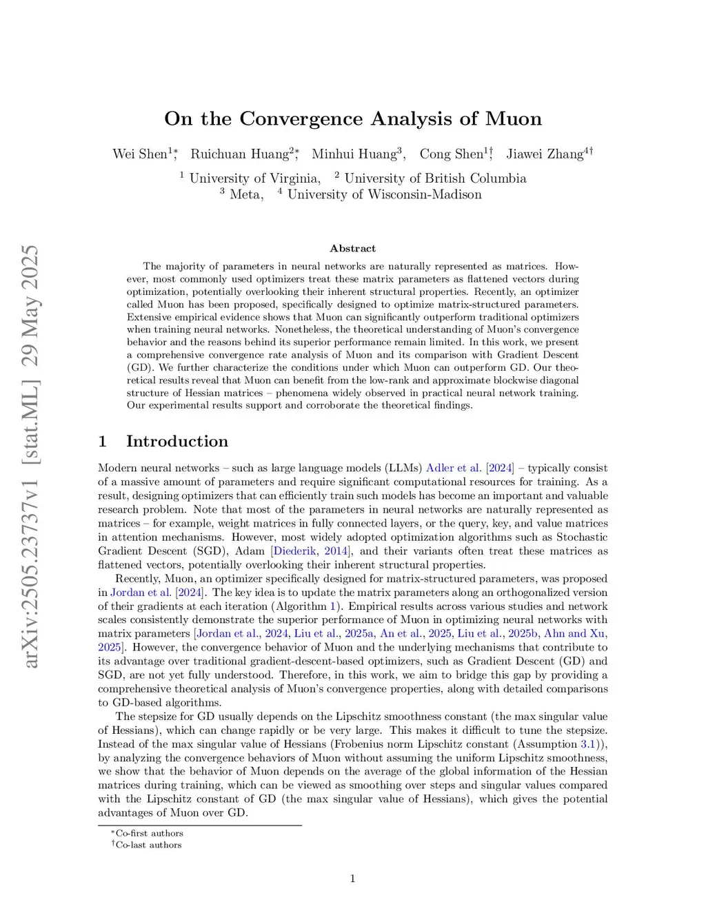The majority of parameters in neural networks are naturally represented as matrices. However, most commonly used optimizers treat these matrix parameters as flattened vectors during optimization, potentially overlooking their inherent structural properties. Recently, an optimizer called Muon has been proposed, specifically designed to optimize matrix-structured parameters. Extensive empirical evidence shows that Muon can significantly outperform traditional optimizers when training neural networks. Nonetheless, the theoretical understanding of Muon's convergence behavior and the reasons behind its superior performance remain limited. In this work, we present a comprehensive convergence rate analysis of Muon and its comparison with Gradient Descent (GD). We further characterize the conditions under which Muon can outperform GD. Our theoretical results reveal that Muon can benefit from the low-rank and approximate blockwise diagonal structure of Hessian matrices -- phenomena widely observed in practical neural network training. Our experimental results support and corroborate the theoretical findings.