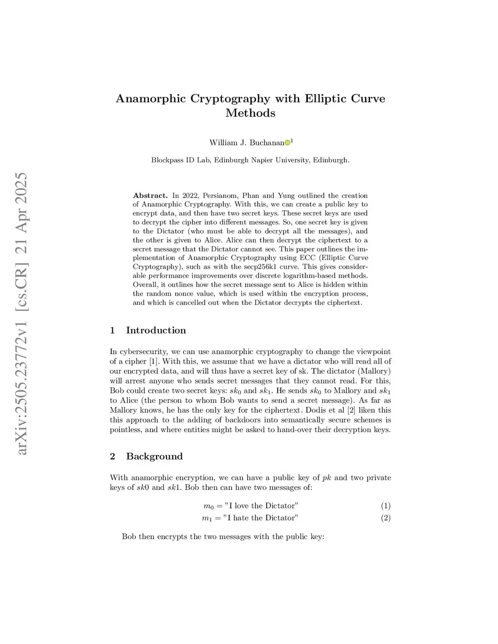 In 2022, Persianom, Phan and Yung outlined the creation of Anamorphic Cryptography. With this, we can create a public key to encrypt data, and then have two secret keys. These secret keys are used to decrypt the cipher into different messages. So, one secret key is given to the Dictator (who must be able to decrypt all the messages), and the other is given to Alice. Alice can then decrypt the ciphertext to a secret message that the Dictator cannot see. This paper outlines the implementation of Anamorphic Cryptography using ECC (Elliptic Curve Cryptography), such as with the secp256k1 curve. This gives considerable performance improvements over discrete logarithm-based methods with regard to security for a particular bit length. Overall, it outlines how the secret message sent to Alice is hidden within the random nonce value, which is used within the encryption process, and which is cancelled out when the Dictator decrypts the ciphertext. It also shows that the BSGS (Baby-step Giant-step) variant significantly outperforms unoptimised elliptic curve methods.