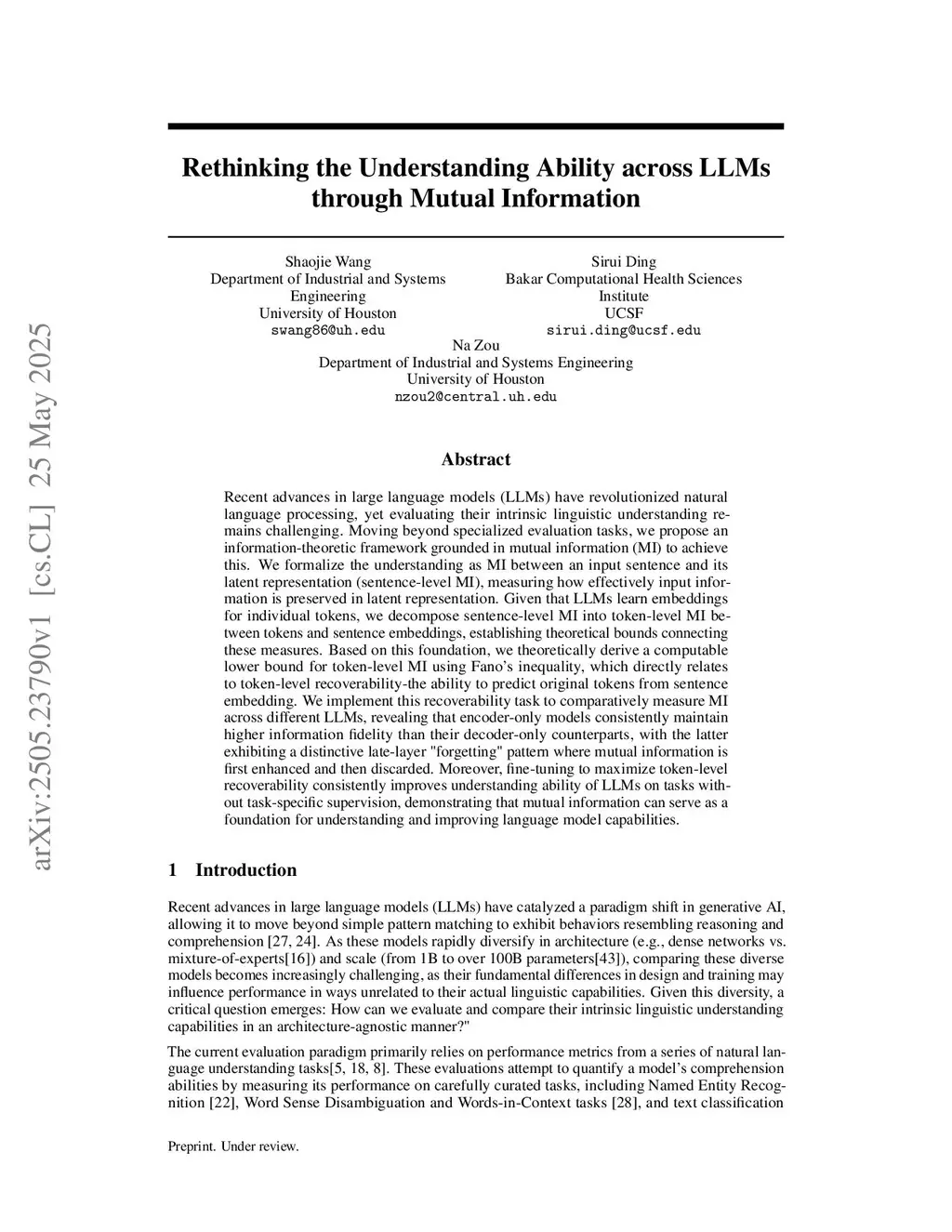 Recent advances in large language models (LLMs) have revolutionized natural language processing, yet evaluating their intrinsic linguistic understanding remains challenging. Moving beyond specialized evaluation tasks, we propose an information-theoretic framework grounded in mutual information (MI) to achieve this. We formalize the understanding as MI between an input sentence and its latent representation (sentence-level MI), measuring how effectively input information is preserved in latent representation. Given that LLMs learn embeddings for individual tokens, we decompose sentence-level MI into token-level MI between tokens and sentence embeddings, establishing theoretical bounds connecting these measures. Based on this foundation, we theoretically derive a computable lower bound for token-level MI using Fano's inequality, which directly relates to token-level recoverability-the ability to predict original tokens from sentence embedding. We implement this recoverability task to comparatively measure MI across different LLMs, revealing that encoder-only models consistently maintain higher information fidelity than their decoder-only counterparts, with the latter exhibiting a distinctive late-layer "forgetting" pattern where mutual information is first enhanced and then discarded. Moreover, fine-tuning to maximize token-level recoverability consistently improves understanding ability of LLMs on tasks without task-specific supervision, demonstrating that mutual information can serve as a foundation for understanding and improving language model capabilities.