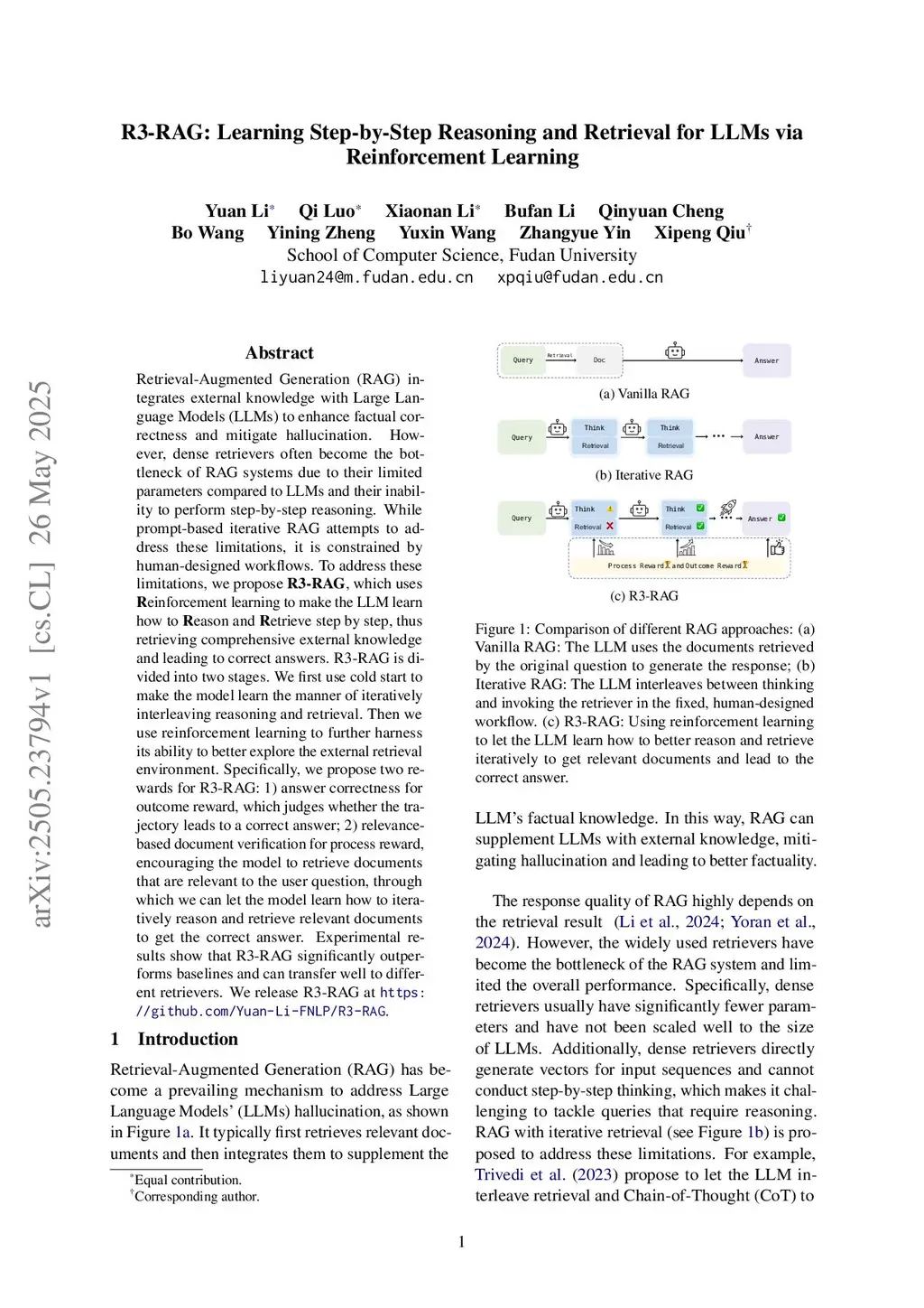 Retrieval-Augmented Generation (RAG) integrates external knowledge with Large Language Models (LLMs) to enhance factual correctness and mitigate hallucination. However, dense retrievers often become the bottleneck of RAG systems due to their limited parameters compared to LLMs and their inability to perform step-by-step reasoning. While prompt-based iterative RAG attempts to address these limitations, it is constrained by human-designed workflows. To address these limitations, we propose , which uses einforcement learning to make the LLM learn how to eason and etrieve step by step, thus retrieving comprehensive external knowledge and leading to correct answers. R3-RAG is divided into two stages. We first use cold start to make the model learn the manner of iteratively interleaving reasoning and retrieval. Then we use reinforcement learning to further harness its ability to better explore the external retrieval environment. Specifically, we propose two rewards for R3-RAG: 1) answer correctness for outcome reward, which judges whether the trajectory leads to a correct answer; 2) relevance-based document verification for process reward, encouraging the model to retrieve documents that are relevant to the user question, through which we can let the model learn how to iteratively reason and retrieve relevant documents to get the correct answer. Experimental results show that R3-RAG significantly outperforms baselines and can transfer well to different retrievers. We release R3-RAG at this https URL.