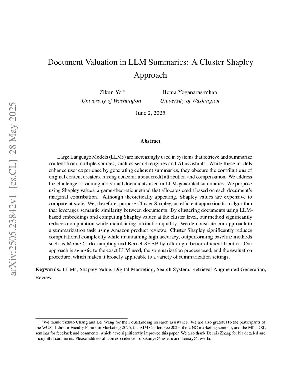 Large Language Models (LLMs) are increasingly used in systems that retrieve and summarize content from multiple sources, such as search engines and AI assistants. While these systems enhance user experience through coherent summaries, they obscure the individual contributions of original content creators, raising concerns about credit attribution and compensation. We address the challenge of valuing individual documents used in LLM-generated summaries by proposing a Shapley value-based framework for fair document valuation. Although theoretically appealing, exact Shapley value computation is prohibitively expensive at scale. To improve efficiency, we develop Cluster Shapley, a simple approximation algorithm that leverages semantic similarity among documents to reduce computation while maintaining attribution accuracy. Using Amazon product review data, we empirically show that off-the-shelf Shapley approximations, such as Monte Carlo sampling and Kernel SHAP, perform suboptimally in LLM settings, whereas Cluster Shapley substantially improves the efficiency-accuracy frontier. Moreover, simple attribution rules (e.g., equal or relevance-based allocation), though computationally cheap, lead to highly unfair outcomes. Together, our findings highlight the potential of structure-aware Shapley approximations tailored to LLM summarization and offer guidance for platforms seeking scalable and fair content attribution mechanisms.