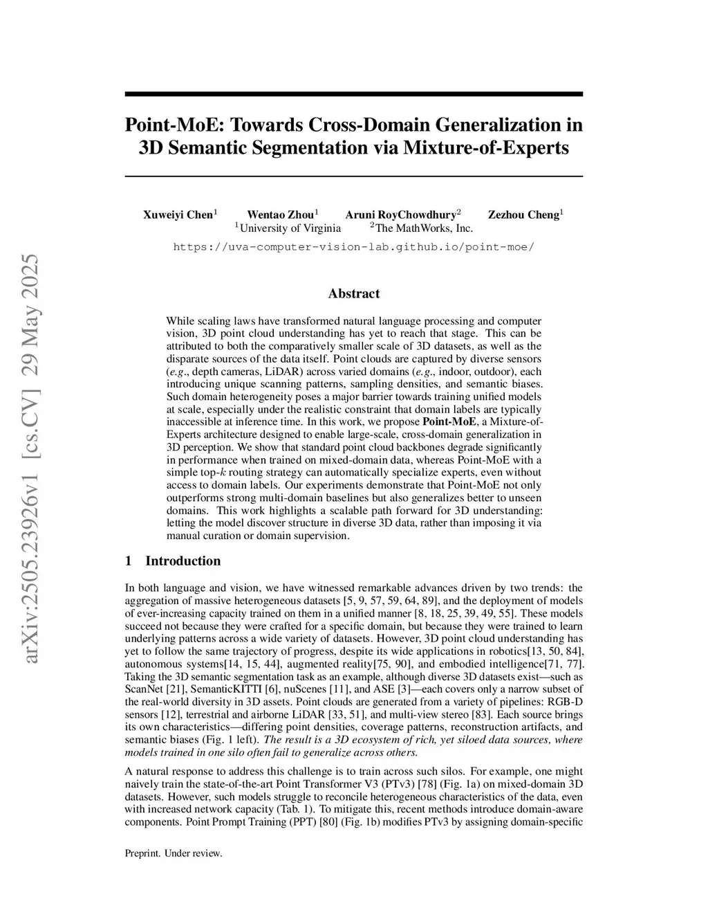While massively scaling both data and models have become central in NLP and 2D vision, their benefits for 3D point cloud understanding remain limited. We study the initial step of scaling 3D point cloud understanding under a realistic regime: large-scale multi-dataset joint training for 3D semantic segmentation, with no dataset labels available at training or inference time. Point clouds arise from a wide range of sensors (e.g., depth cameras, LiDAR) and scenes (\eg, indoor, outdoor), yielding heterogeneous scanning patterns, sampling densities, and semantic biases; naively mixing such datasets degrades standard models. Therefore, we introduce Point-MoE, a Mixture-of-Experts design that expands model capacity through sparsely activated expert MLPs and a lightweight top- router, allowing tokens to select specialized experts without requiring dataset supervision. Trained jointly on a diverse mix of indoor and outdoor datasets, and evaluated on seen datasets as well as in zero-shot settings, Point-MoE outperforms prior methods without using dataset labels for either training or inference. This outlines a scalable path for 3D perception: letting the model discover structure in heterogeneous 3D data rather than imposing it via manual curation or dataset-specific heuristics.