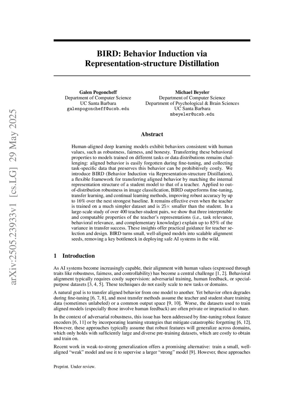 Human-aligned deep learning models exhibit behaviors consistent with human values, such as robustness, fairness, and honesty. Transferring these behavioral properties to models trained on different tasks or data distributions remains challenging: aligned behavior is easily forgotten during fine-tuning, and collecting task-specific data that preserves this behavior can be prohibitively costly. We introduce BIRD (Behavior Induction via Representation-structure Distillation), a flexible framework for transferring aligned behavior by matching the internal representation structure of a student model to that of a teacher. Applied to out-of-distribution robustness in image classification, BIRD outperforms fine-tuning, transfer learning, and continual learning methods, improving robust accuracy by up to 16% over the next strongest baseline. It remains effective even when the teacher is trained on a much simpler dataset and is smaller than the student. In a large-scale study of over 400 teacher-student pairs, we show that three interpretable and computable properties of the teacher's representations (i.e., task relevance, behavioral relevance, and complementary knowledge) explain up to 85% of the variance in transfer success. These insights offer practical guidance for teacher selection and design. BIRD turns small, well-aligned models into scalable alignment seeds, removing a key bottleneck in deploying safe AI systems in the wild.
