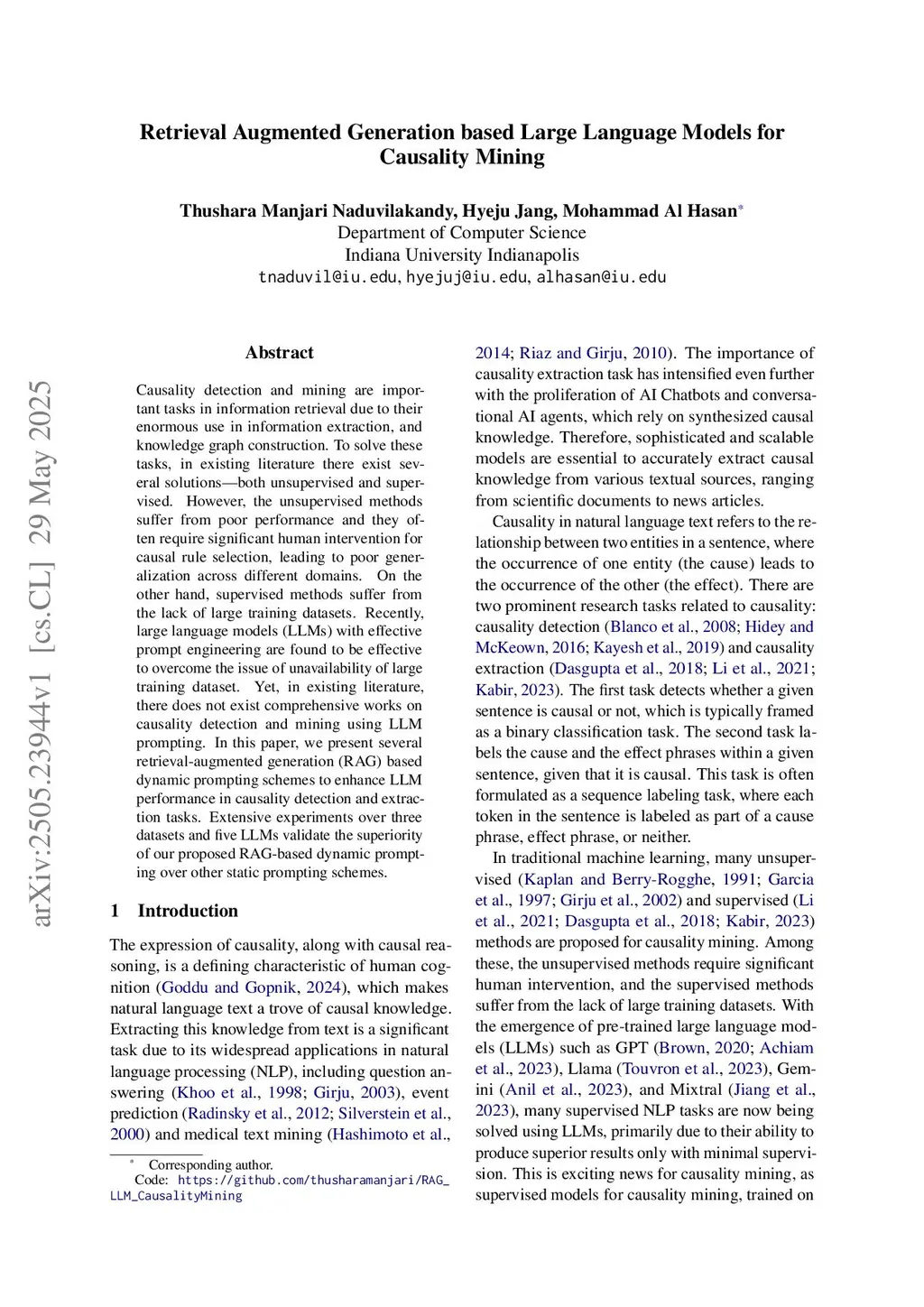 Retrieval Augmented Generation based Large Language Models for Causality Mining