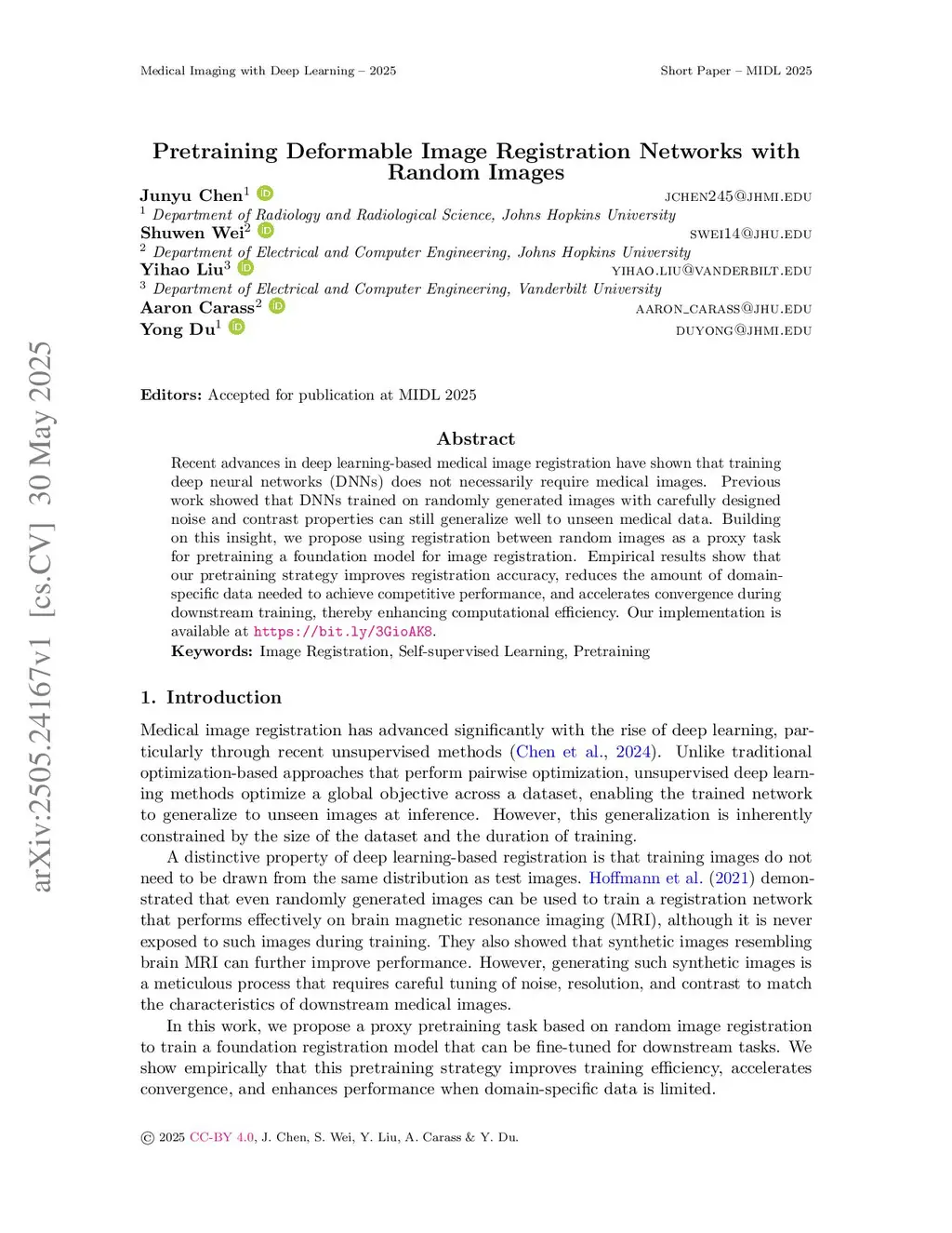 Recent advances in deep learning-based medical image registration have shown that training deep neural networks~(DNNs) does not necessarily require medical images. Previous work showed that DNNs trained on randomly generated images with carefully designed noise and contrast properties can still generalize well to unseen medical data. Building on this insight, we propose using registration between random images as a proxy task for pretraining a foundation model for image registration. Empirical results show that our pretraining strategy improves registration accuracy, reduces the amount of domain-specific data needed to achieve competitive performance, and accelerates convergence during downstream training, thereby enhancing computational efficiency.