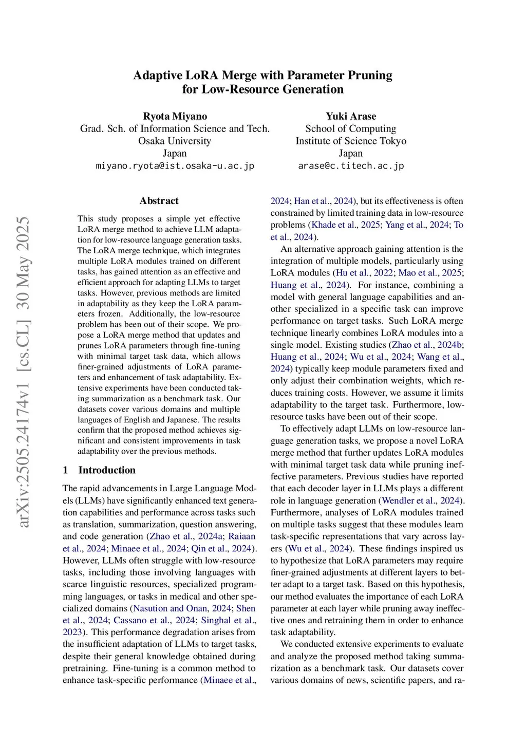 Adaptive LoRA Merge with Parameter Pruning for Low-Resource Generation