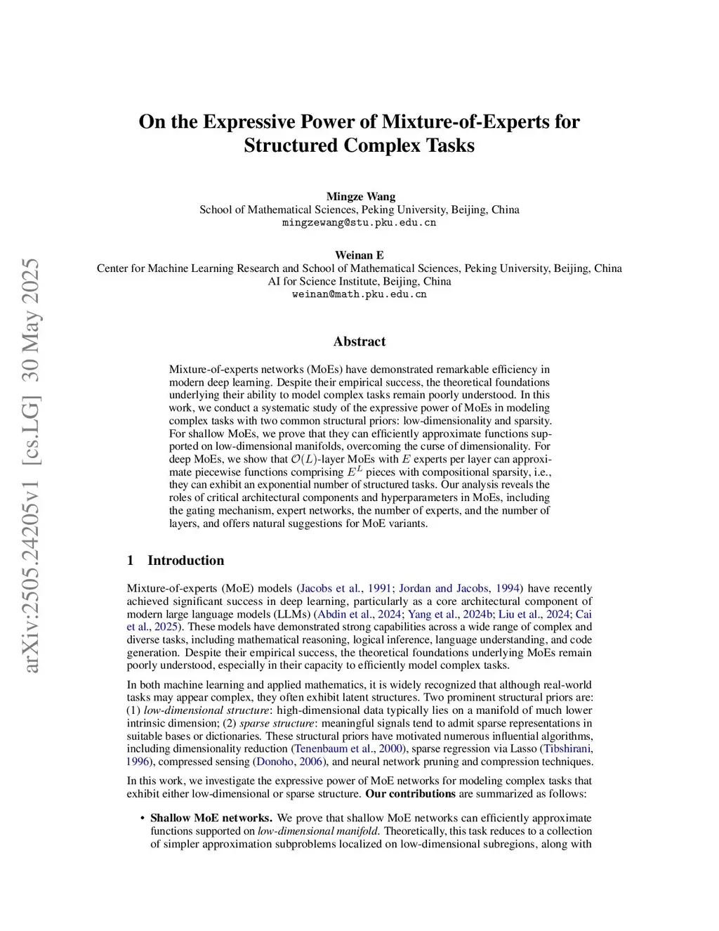 Mixture-of-experts networks (MoEs) have demonstrated remarkable efficiency in modern deep learning. Despite their empirical success, the theoretical foundations underlying their ability to model complex tasks remain poorly understood. In this work, we conduct a systematic study of the expressive power of MoEs in modeling complex tasks with two common structural priors: low-dimensionality and sparsity. For shallow MoEs, we prove that they can efficiently approximate functions supported on low-dimensional manifolds, overcoming the curse of dimensionality. For deep MoEs, we show that -layer MoEs with experts per layer can approximate piecewise functions comprising pieces with compositional sparsity, i.e., they can exhibit an exponential number of structured tasks. Our analysis reveals the roles of critical architectural components and hyperparameters in MoEs, including the gating mechanism, expert networks, the number of experts, and the number of layers, and offers natural suggestions for MoE variants.