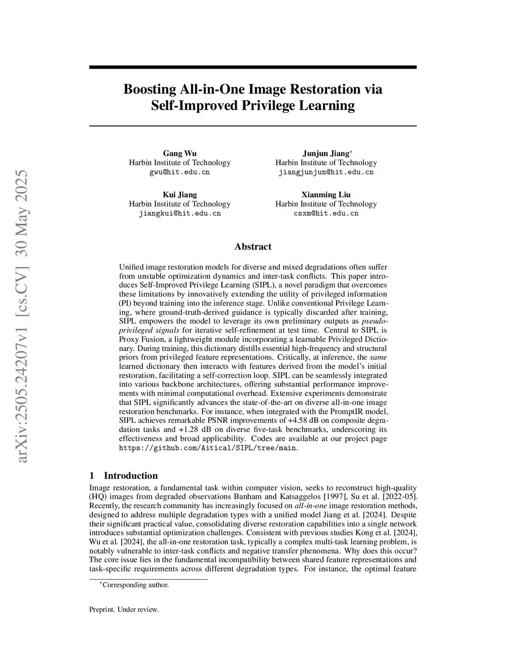 Unified image restoration models for diverse and mixed degradations often suffer from unstable optimization dynamics and inter-task conflicts. This paper introduces Self-Improved Privilege Learning (SIPL), a novel paradigm that overcomes these limitations by innovatively extending the utility of privileged information (PI) beyond training into the inference stage. Unlike conventional Privilege Learning, where ground-truth-derived guidance is typically discarded after training, SIPL empowers the model to leverage its own preliminary outputs as pseudo-privileged signals for iterative self-refinement at test time. Central to SIPL is Proxy Fusion, a lightweight module incorporating a learnable Privileged Dictionary. During training, this dictionary distills essential high-frequency and structural priors from privileged feature representations. Critically, at inference, the same learned dictionary then interacts with features derived from the model's initial restoration, facilitating a self-correction loop. SIPL can be seamlessly integrated into various backbone architectures, offering substantial performance improvements with minimal computational overhead. Extensive experiments demonstrate that SIPL significantly advances the state-of-the-art on diverse all-in-one image restoration benchmarks. For instance, when integrated with the PromptIR model, SIPL achieves remarkable PSNR improvements of +4.58 dB on composite degradation tasks and +1.28 dB on diverse five-task benchmarks, underscoring its effectiveness and broad applicability. Codes are available at our project pagethis https URL.