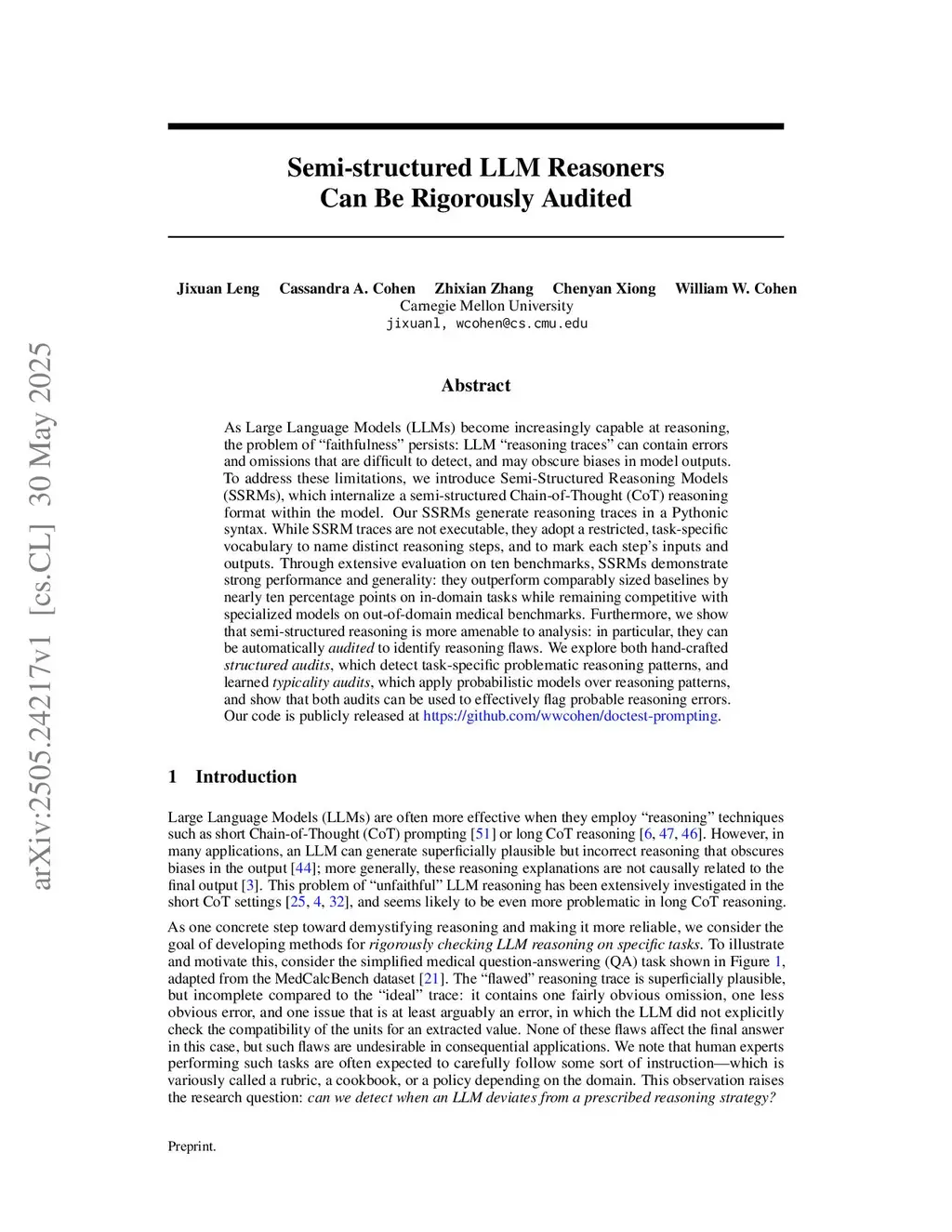 Although Large Language Models (LLMs) have become capable reasoners, the problem of faithfulness persists: their reasoning can contain errors and omissions that are difficult to detect and that may obscure biases in model outputs. To address this issue, we introduce Semi-Structured Reasoning Models (SSRMs), which are trained to produce semi-structured representations of reasoning. SSRMs generate reasoning traces in a non-executable Pythonic syntax that names each reasoning step and marks its inputs and outputs. This structure allows SSRM traces to be automatically audited to identify reasoning flaws. We evaluate three types of audits: hand-crafted structured reasoning audits, written in a domain-specific language (DSL) implemented in Python; LLM-generated structured reasoning audits; and learned typicality audits, which apply probabilistic models over reasoning traces. We show that all of these methods can be used to effectively flag probable reasoning errors. Importantly, the auditability of SSRMs does not appear to compromise overall accuracy: in evaluation on twelve benchmarks and two model families, SSRMs demonstrate strong performance and generalizability relative to other models of comparable size.