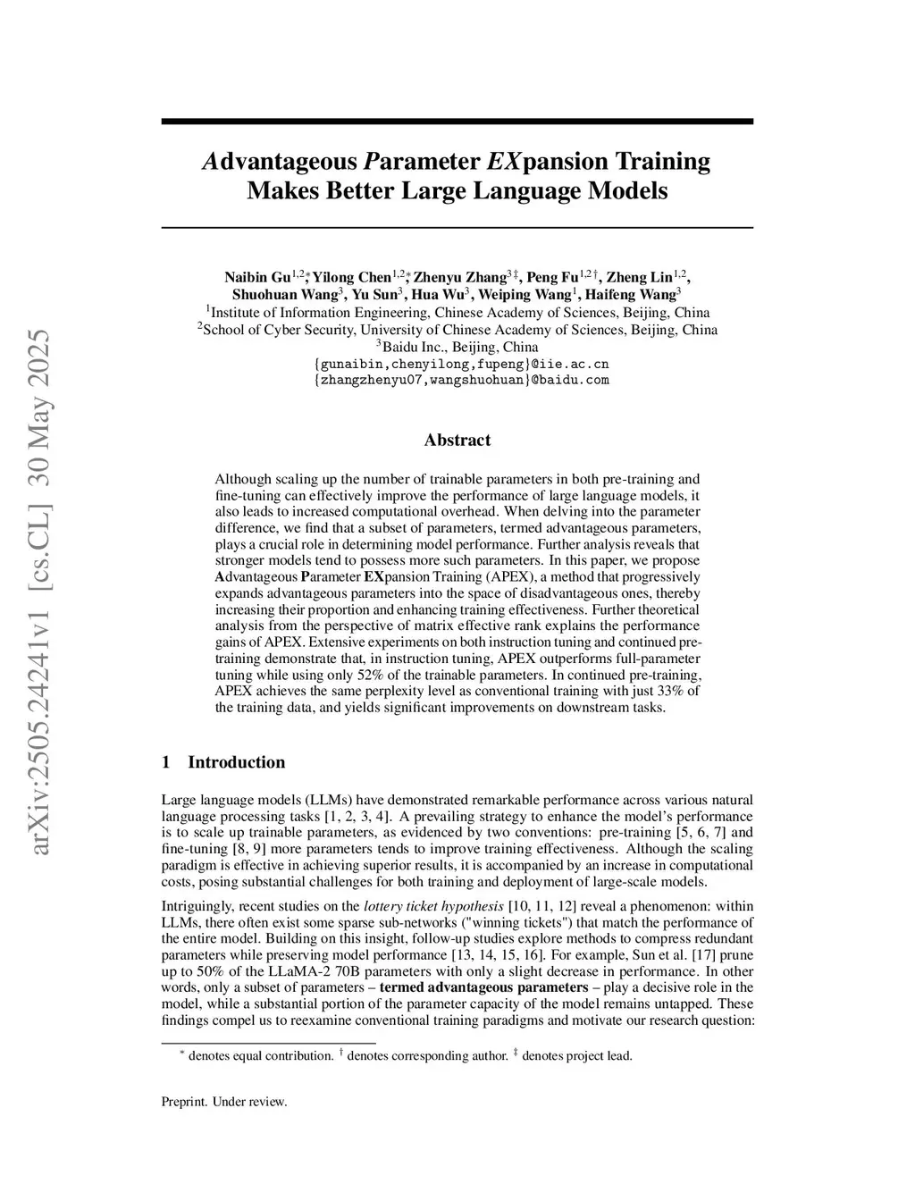 Although scaling up the number of trainable parameters in both pre-training and fine-tuning can effectively improve the performance of large language models, it also leads to increased computational overhead. When delving into the parameter difference, we find that a subset of parameters, termed advantageous parameters, plays a crucial role in determining model performance. Further analysis reveals that stronger models tend to possess more such parameters. In this paper, we propose Advantageous Parameter EXpansion Training (APEX), a method that progressively expands advantageous parameters into the space of disadvantageous ones, thereby increasing their proportion and enhancing training effectiveness. Further theoretical analysis from the perspective of matrix effective rank explains the performance gains of APEX. Extensive experiments on both instruction tuning and continued pre-training demonstrate that, in instruction tuning, APEX outperforms full-parameter tuning while using only 52% of the trainable parameters. In continued pre-training, APEX achieves the same perplexity level as conventional training with just 33% of the training data, and yields significant improvements on downstream tasks.
