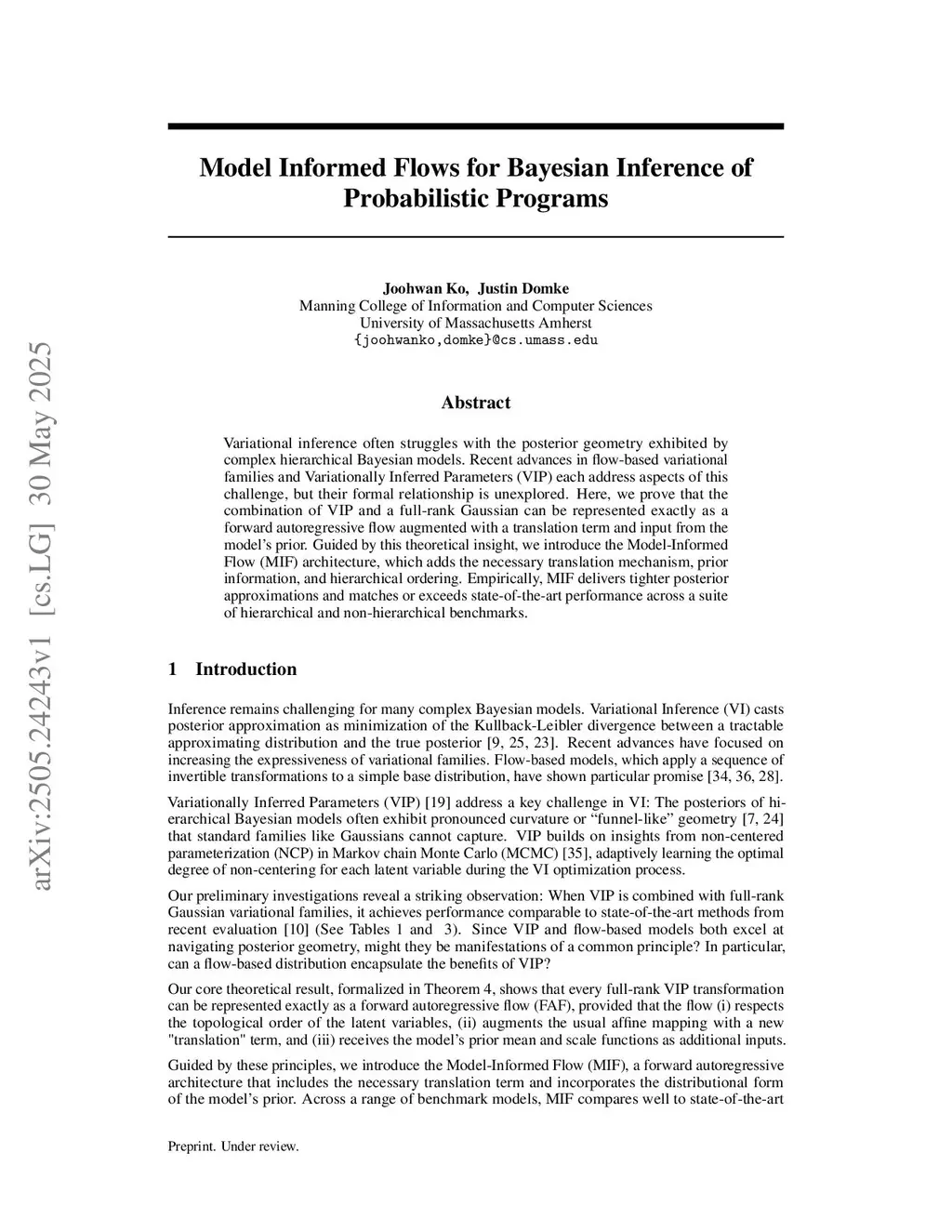 Variational inference often struggles with the posterior geometry exhibited by complex hierarchical Bayesian models. Recent advances in flow-based variational families and Variationally Inferred Parameters (VIP) each address aspects of this challenge, but their formal relationship is unexplored. Here, we prove that the combination of VIP and a full-rank Gaussian can be represented exactly as a forward autoregressive flow augmented with a translation term and input from the model's prior. Guided by this theoretical insight, we introduce the Model-Informed Flow (MIF) architecture, which adds the necessary translation mechanism, prior information, and hierarchical ordering. Empirically, MIF delivers tighter posterior approximations and matches or exceeds state-of-the-art performance across a suite of hierarchical and non-hierarchical benchmarks.