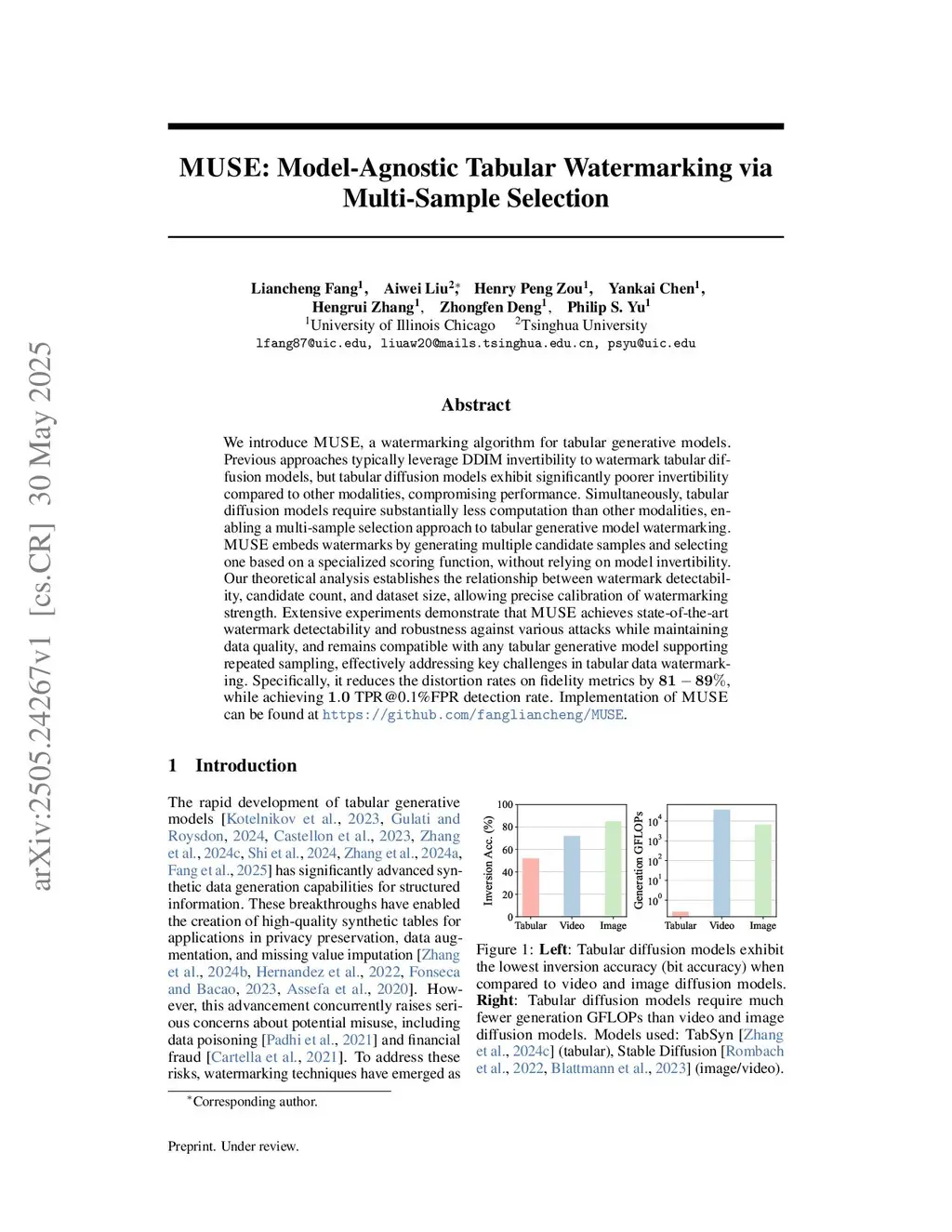 We introduce MUSE, a watermarking algorithm for tabular generative models. Previous approaches typically leverage DDIM invertibility to watermark tabular diffusion models, but tabular diffusion models exhibit significantly poorer invertibility compared to other modalities, compromising performance. Simultaneously, tabular diffusion models require substantially less computation than other modalities, enabling a multi-sample selection approach to tabular generative model watermarking. MUSE embeds watermarks by generating multiple candidate samples and selecting one based on a specialized scoring function, without relying on model invertibility. Our theoretical analysis establishes the relationship between watermark detectability, candidate count, and dataset size, allowing precise calibration of watermarking strength. Extensive experiments demonstrate that MUSE achieves state-of-the-art watermark detectability and robustness against various attacks while maintaining data quality, and remains compatible with any tabular generative model supporting repeated sampling, effectively addressing key challenges in tabular data watermarking. Specifically, it reduces the distortion rates on fidelity metrics by 81-89%, while achieving a 1.0 TPR@0.1%FPR detection rate. Implementation of MUSE can be found atthis https URL.