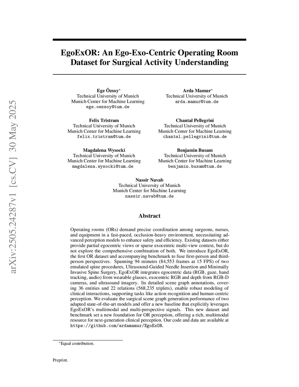 Operating rooms (ORs) demand precise coordination among surgeons, nurses, and equipment in a fast-paced, occlusion-heavy environment, necessitating advanced perception models to enhance safety and efficiency. Existing datasets either provide partial egocentric views or sparse exocentric multi-view context, but do not explore the comprehensive combination of both. We introduce EgoExOR, the first OR dataset and accompanying benchmark to fuse first-person and third-person perspectives. Spanning 94 minutes (84,553 frames at 15 FPS) of two emulated spine procedures, Ultrasound-Guided Needle Insertion and Minimally Invasive Spine Surgery, EgoExOR integrates egocentric data (RGB, gaze, hand tracking, audio) from wearable glasses, exocentric RGB and depth from RGB-D cameras, and ultrasound imagery. Its detailed scene graph annotations, covering 36 entities and 22 relations (568,235 triplets), enable robust modeling of clinical interactions, supporting tasks like action recognition and human-centric perception. We evaluate the surgical scene graph generation performance of two adapted state-of-the-art models and offer a new baseline that explicitly leverages EgoExOR's multimodal and multi-perspective signals. This new dataset and benchmark set a new foundation for OR perception, offering a rich, multimodal resource for next-generation clinical perception.
