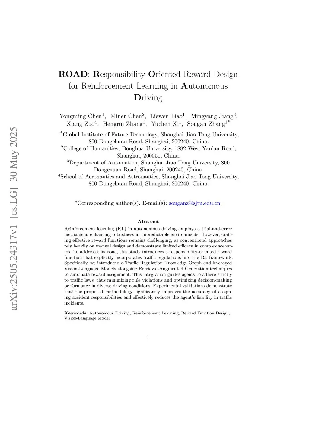 Reinforcement learning (RL) in autonomous driving employs a trial-and-error mechanism, enhancing robustness in unpredictable environments. However, crafting effective reward functions remains challenging, as conventional approaches rely heavily on manual design and demonstrate limited efficacy in complex scenarios. To address this issue, this study introduces a responsibility-oriented reward function that explicitly incorporates traffic regulations into the RL framework. Specifically, we introduced a Traffic Regulation Knowledge Graph and leveraged Vision-Language Models alongside Retrieval-Augmented Generation techniques to automate reward assignment. This integration guides agents to adhere strictly to traffic laws, thus minimizing rule violations and optimizing decision-making performance in diverse driving conditions. Experimental validations demonstrate that the proposed methodology significantly improves the accuracy of assigning accident responsibilities and effectively reduces the agent's liability in traffic incidents.