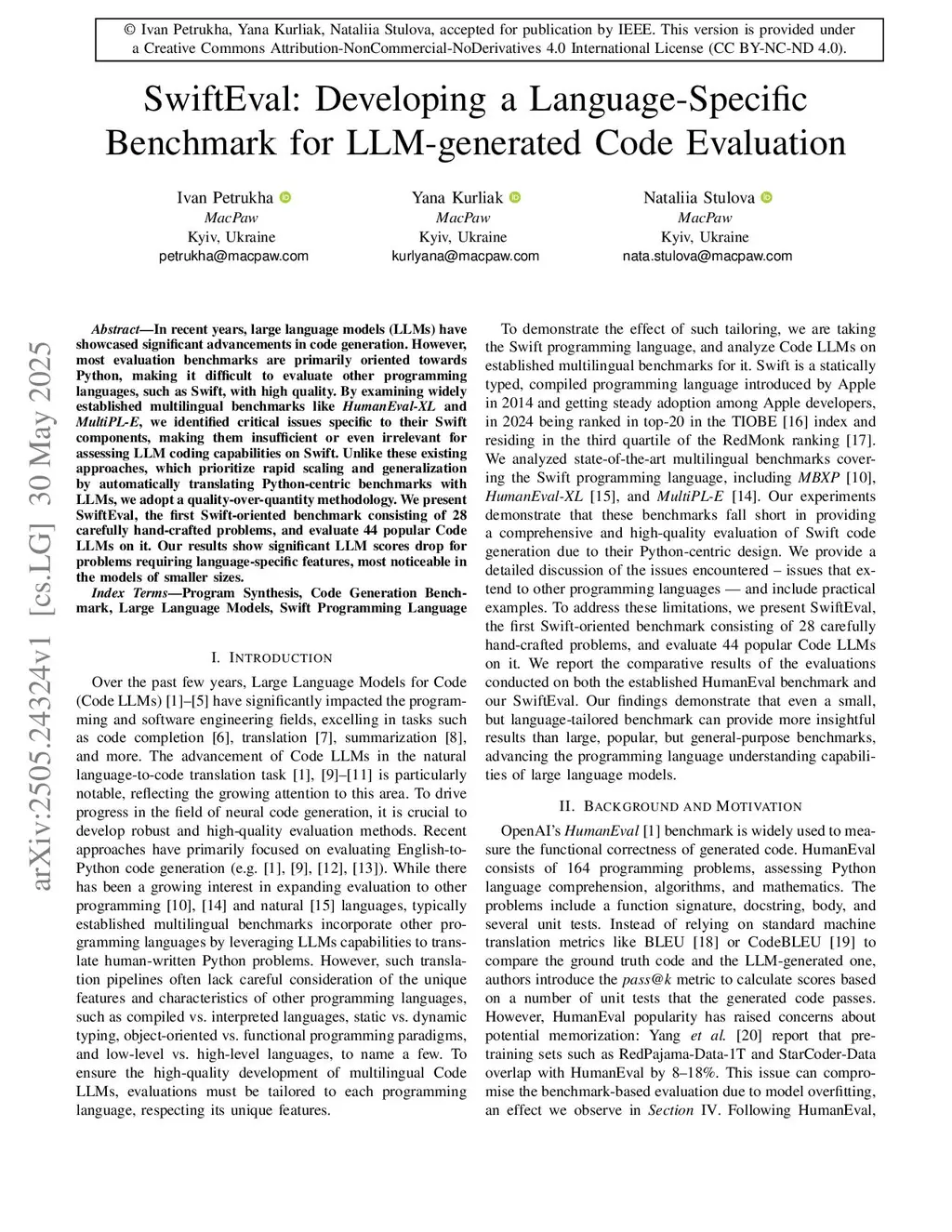 In recent years, large language models (LLMs) have showcased significant advancements in code generation. However, most evaluation benchmarks are primarily oriented towards Python, making it difficult to evaluate other programming languages, such as Swift, with high quality. By examining widely established multilingual benchmarks like HumanEval-XL and MultiPL-E, we identified critical issues specific to their Swift components, making them insufficient or even irrelevant for assessing LLM coding capabilities on Swift. Unlike these existing approaches, which prioritize rapid scaling and generalization by automatically translating Python-centric benchmarks with LLMs, we adopt a quality-over-quantity methodology. We present SwiftEval, the first Swift-oriented benchmark consisting of 28 carefully hand-crafted problems, and evaluate 44 popular Code LLMs on it. Our results show significant LLM scores drop for problems requiring language-specific features, most noticeable in the models of smaller sizes.