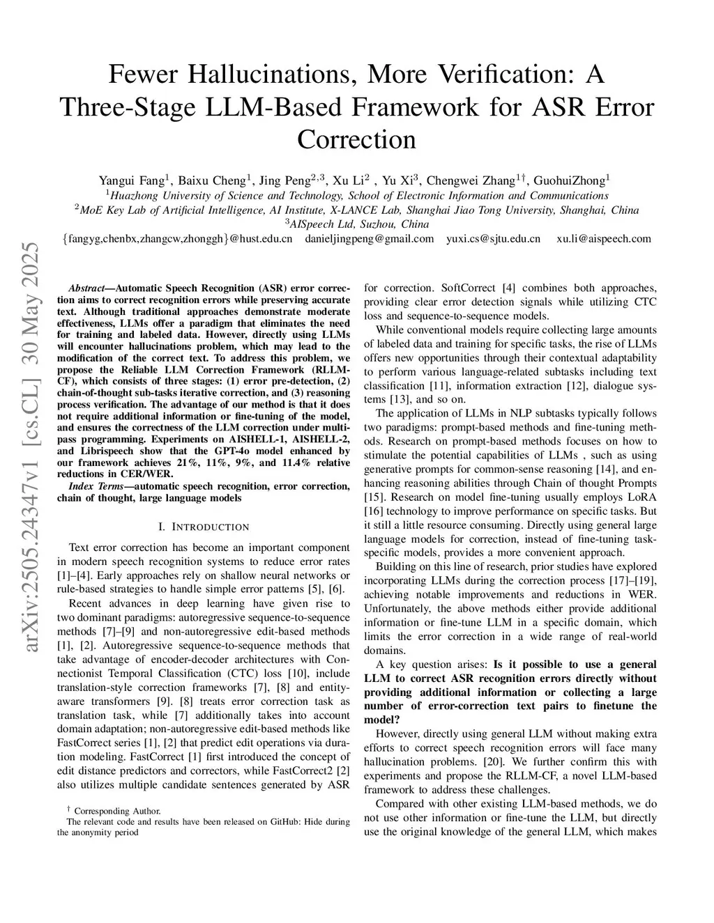 Automatic Speech Recognition (ASR) error correction aims to correct recognition errors while preserving accurate text. Although traditional approaches demonstrate moderate effectiveness, LLMs offer a paradigm that eliminates the need for training and labeled data. However, directly using LLMs will encounter hallucinations problem, which may lead to the modification of the correct text. To address this problem, we propose the Reliable LLM Correction Framework (RLLM-CF), which consists of three stages: (1) error pre-detection, (2) chain-of-thought sub-tasks iterative correction, and (3) reasoning process verification. The advantage of our method is that it does not require additional information or fine-tuning of the model, and ensures the correctness of the LLM correction under multi-pass programming. Experiments on AISHELL-1, AISHELL-2, and Librispeech show that the GPT-4o model enhanced by our framework achieves 21%, 11%, 9%, and 11.4% relative reductions in CER/WER.