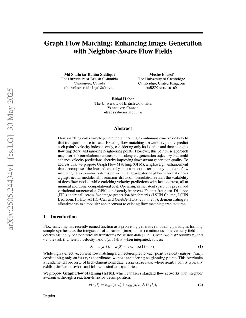 Flow matching casts sample generation as learning a continuous-time velocity field that transports noise to data. Existing flow matching networks typically predict each point's velocity independently, considering only its location and time along its flow trajectory, and ignoring neighboring points. However, this pointwise approach may overlook correlations between points along the generation trajectory that could enhance velocity predictions, thereby improving downstream generation quality. To address this, we propose Graph Flow Matching (GFM), a lightweight enhancement that decomposes the learned velocity into a reaction term -- any standard flow matching network -- and a diffusion term that aggregates neighbor information via a graph neural module. This reaction-diffusion formulation retains the scalability of deep flow models while enriching velocity predictions with local context, all at minimal additional computational cost. Operating in the latent space of a pretrained variational autoencoder, GFM consistently improves Fréchet Inception Distance (FID) and recall across five image generation benchmarks (LSUN Church, LSUN Bedroom, FFHQ, AFHQ-Cat, and CelebA-HQ at ), demonstrating its effectiveness as a modular enhancement to existing flow matching architectures.