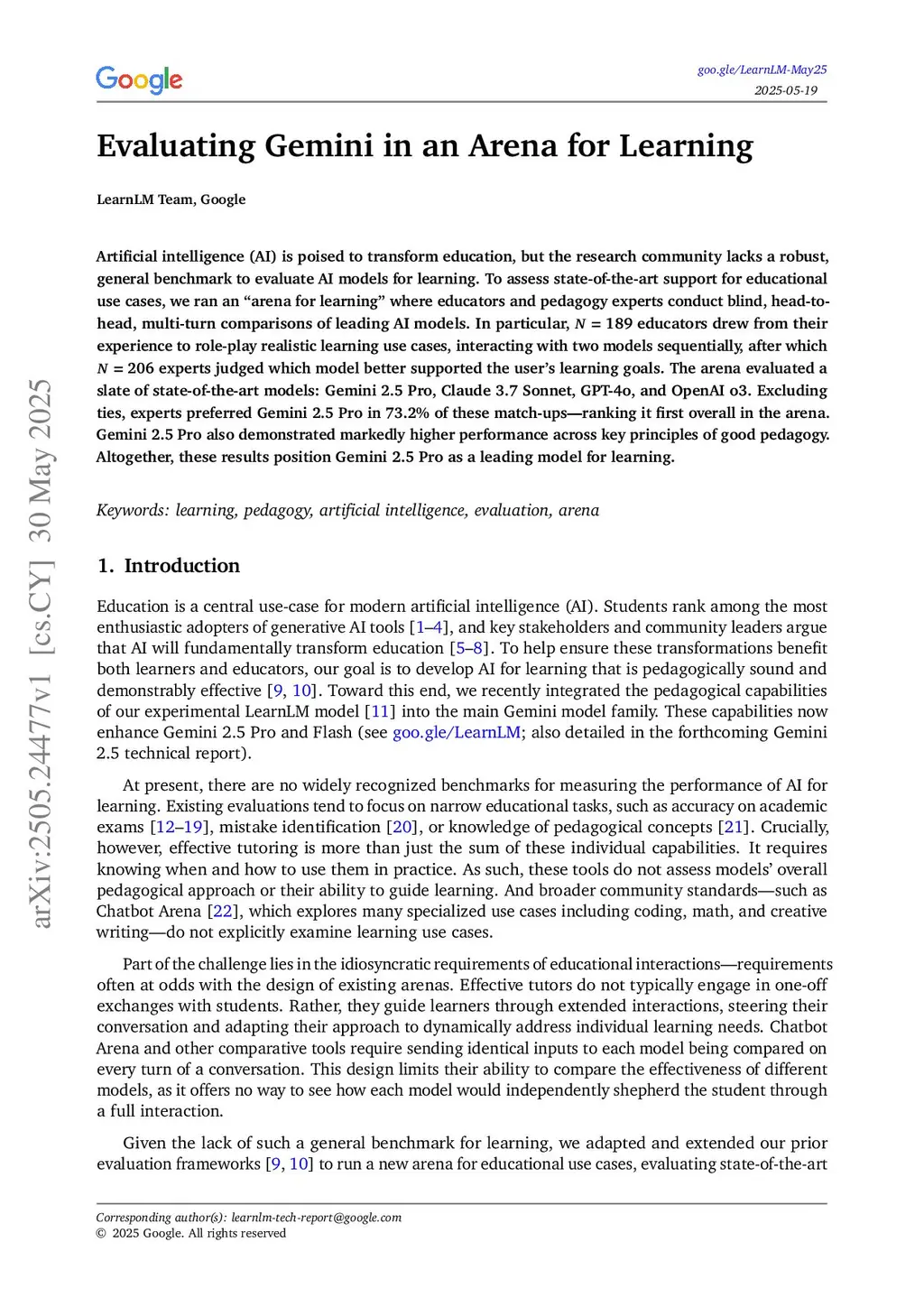Artificial intelligence (AI) is poised to transform education, but the research community lacks a robust, general benchmark to evaluate AI models for learning. To assess state-of-the-art support for educational use cases, we ran an "arena for learning" where educators and pedagogy experts conduct blind, head-to-head, multi-turn comparisons of leading AI models. In particular, educators drew from their experience to role-play realistic learning use cases, interacting with two models sequentially, after which experts judged which model better supported the user's learning goals. The arena evaluated a slate of state-of-the-art models: Gemini 2.5 Pro, Claude 3.7 Sonnet, GPT-4o, and OpenAI o3. Excluding ties, experts preferred Gemini 2.5 Pro in 73.2% of these match-ups -- ranking it first overall in the arena. Gemini 2.5 Pro also demonstrated markedly higher performance across key principles of good pedagogy. Altogether, these results position Gemini 2.5 Pro as a leading model for learning.