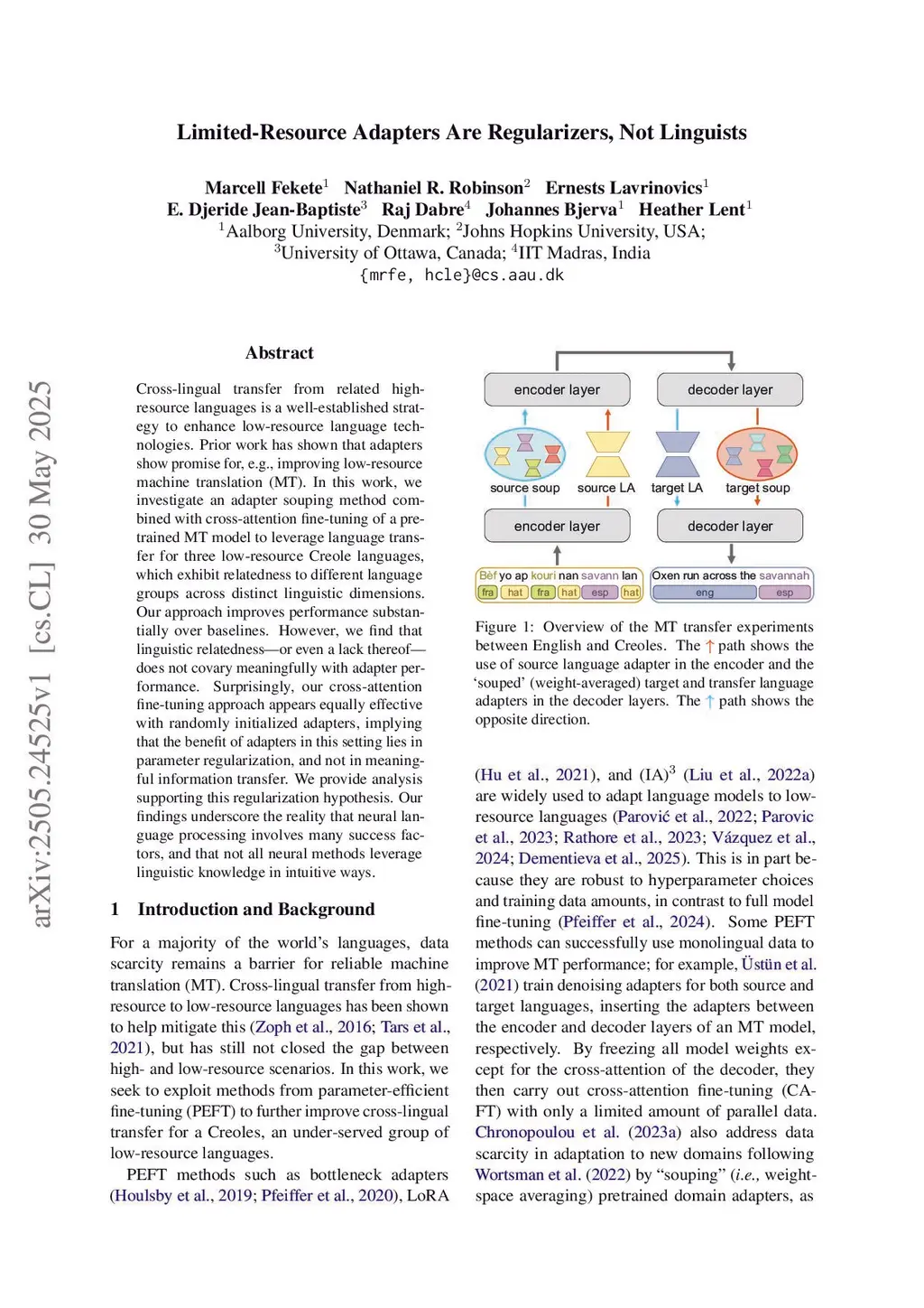 Cross-lingual transfer from related high-resource languages is a well-established strategy to enhance low-resource language technologies. Prior work has shown that adapters show promise for, e.g., improving low-resource machine translation (MT). In this work, we investigate an adapter souping method combined with cross-attention fine-tuning of a pre-trained MT model to leverage language transfer for three low-resource Creole languages, which exhibit relatedness to different language groups across distinct linguistic dimensions. Our approach improves performance substantially over baselines. However, we find that linguistic relatedness -- or even a lack thereof -- does not covary meaningfully with adapter performance. Surprisingly, our cross-attention fine-tuning approach appears equally effective with randomly initialized adapters, implying that the benefit of adapters in this setting lies in parameter regularization, and not in meaningful information transfer. We provide analysis supporting this regularization hypothesis. Our findings underscore the reality that neural language processing involves many success factors, and that not all neural methods leverage linguistic knowledge in intuitive ways.