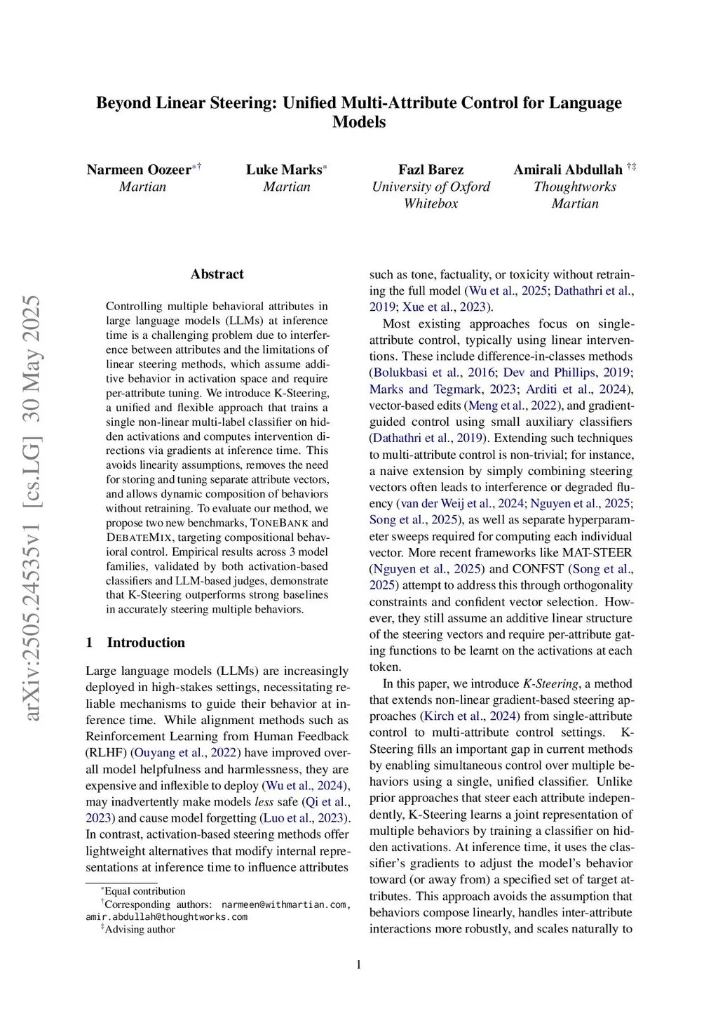 Controlling multiple behavioral attributes in large language models (LLMs) at inference time is a challenging problem due to interference between attributes and the limitations of linear steering methods, which assume additive behavior in activation space and require per-attribute tuning. We introduce K-Steering, a unified and flexible approach that trains a single non-linear multi-label classifier on hidden activations and computes intervention directions via gradients at inference time. This avoids linearity assumptions, removes the need for storing and tuning separate attribute vectors, and allows dynamic composition of behaviors without retraining. To evaluate our method, we propose two new benchmarks, ToneBank and DebateMix, targeting compositional behavioral control. Empirical results across 3 model families, validated by both activation-based classifiers and LLM-based judges, demonstrate that K-Steering outperforms strong baselines in accurately steering multiple behaviors.