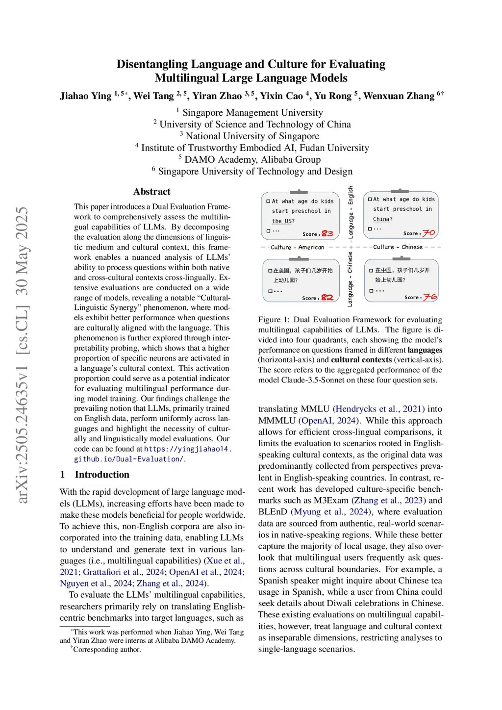 This paper introduces a Dual Evaluation Framework to comprehensively assess the multilingual capabilities of LLMs. By decomposing the evaluation along the dimensions of linguistic medium and cultural context, this framework enables a nuanced analysis of LLMs' ability to process questions within both native and cross-cultural contexts cross-lingually. Extensive evaluations are conducted on a wide range of models, revealing a notable "CulturalLinguistic Synergy" phenomenon, where models exhibit better performance when questions are culturally aligned with the language. This phenomenon is further explored through interpretability probing, which shows that a higher proportion of specific neurons are activated in a language's cultural context. This activation proportion could serve as a potential indicator for evaluating multilingual performance during model training. Our findings challenge the prevailing notion that LLMs, primarily trained on English data, perform uniformly across languages and highlight the necessity of culturally and linguistically model evaluations. Our code can be found at https://yingjiahao14.this http URL.
