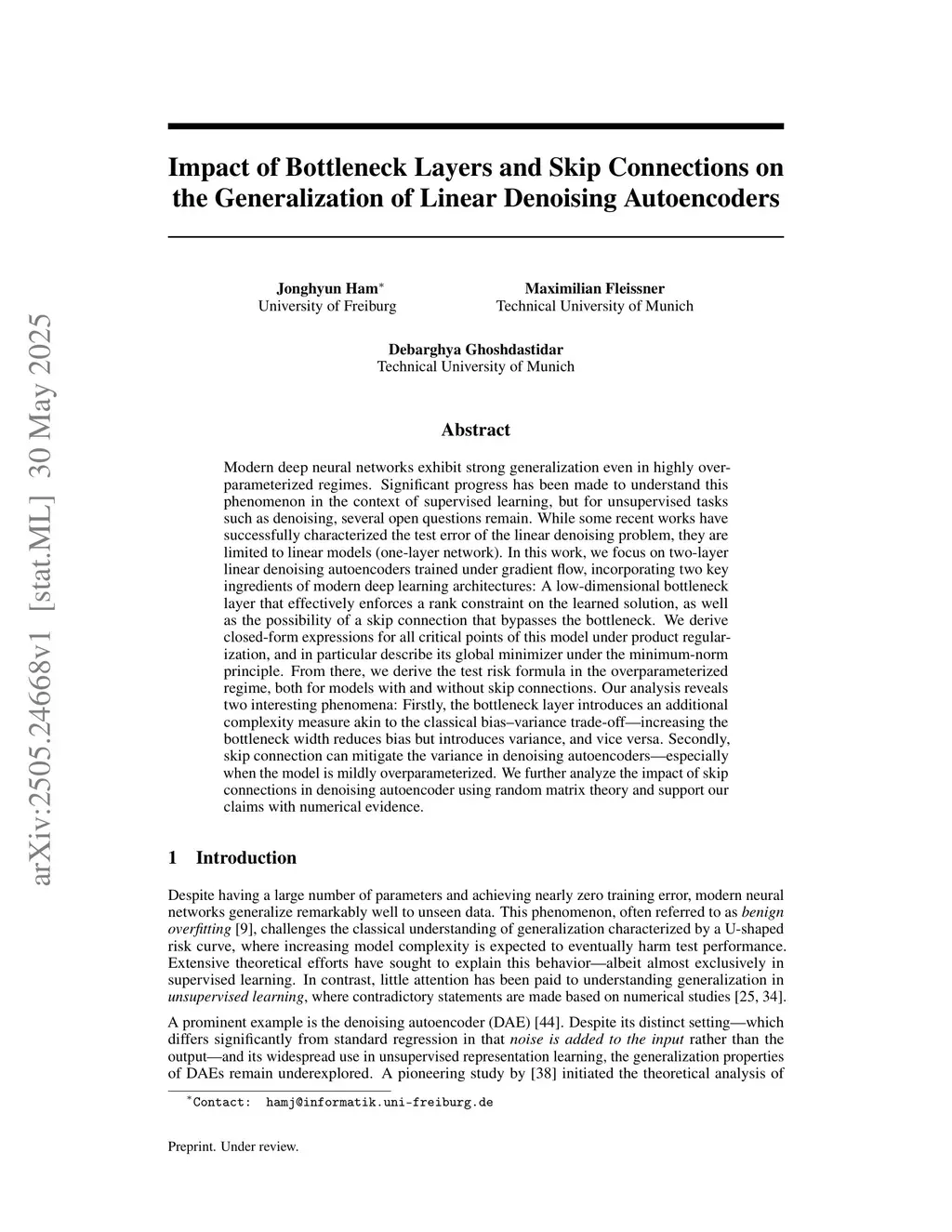 Modern deep neural networks exhibit strong generalization even in highly overparameterized regimes. Significant progress has been made to understand this phenomenon in the context of supervised learning, but for unsupervised tasks such as denoising, several open questions remain. While some recent works have successfully characterized the test error of the linear denoising problem, they are limited to linear models (one-layer network). In this work, we focus on two-layer linear denoising autoencoders trained under gradient flow, incorporating two key ingredients of modern deep learning architectures: A low-dimensional bottleneck layer that effectively enforces a rank constraint on the learned solution, as well as the possibility of a skip connection that bypasses the bottleneck. We derive closed-form expressions for all critical points of this model under product regularization, and in particular describe its global minimizer under the minimum-norm principle. From there, we derive the test risk formula in the overparameterized regime, both for models with and without skip connections. Our analysis reveals two interesting phenomena: Firstly, the bottleneck layer introduces an additional complexity measure akin to the classical bias-variance trade-off -- increasing the bottleneck width reduces bias but introduces variance, and vice versa. Secondly, skip connection can mitigate the variance in denoising autoencoders -- especially when the model is mildly overparameterized. We further analyze the impact of skip connections in denoising autoencoder using random matrix theory and support our claims with numerical evidence.