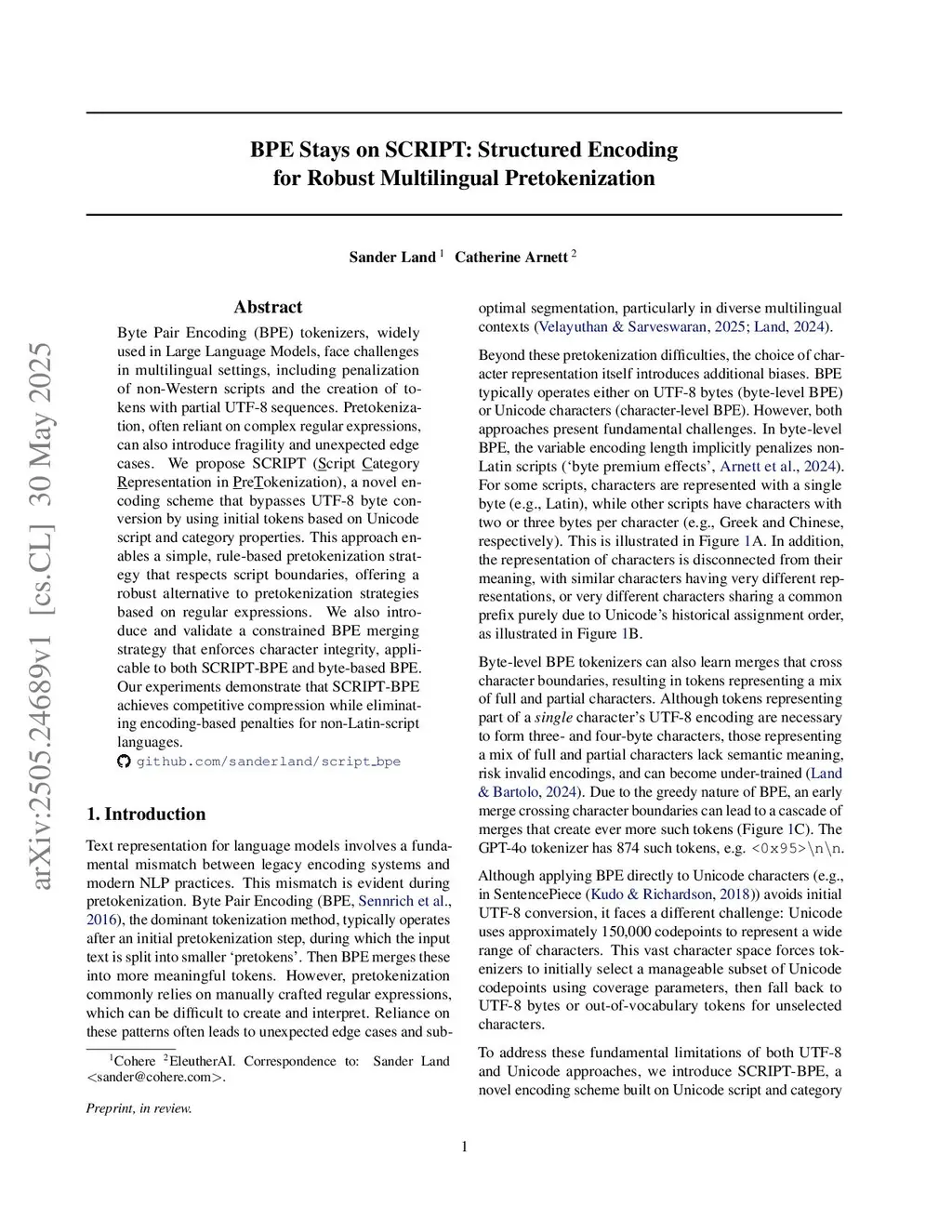 Byte Pair Encoding (BPE) tokenizers, widely used in Large Language Models, face challenges in multilingual settings, including penalization of non-Western scripts and the creation of tokens with partial UTF-8 sequences. Pretokenization, often reliant on complex regular expressions, can also introduce fragility and unexpected edge cases. We propose SCRIPT (Script Category Representation in PreTokenization), a novel encoding scheme that bypasses UTF-8 byte conversion by using initial tokens based on Unicode script and category properties. This approach enables a simple, rule-based pretokenization strategy that respects script boundaries, offering a robust alternative to pretokenization strategies based on regular expressions. We also introduce and validate a constrained BPE merging strategy that enforces character integrity, applicable to both SCRIPT-BPE and byte-based BPE. Our experiments demonstrate that SCRIPT-BPE achieves competitive compression while eliminating encoding-based penalties for non-Latin-script languages.