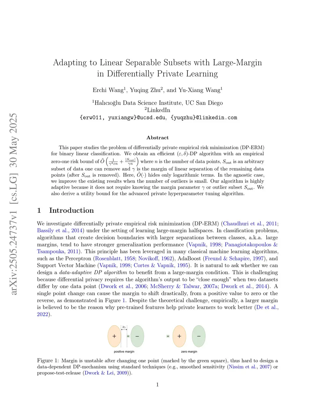 This paper studies the problem of differentially private empirical risk minimization (DP-ERM) for binary linear classification. We obtain an efficient -DP algorithm with an empirical zero-one risk bound of where is the number of data points, is an arbitrary subset of data one can remove and is the margin of linear separation of the remaining data points (after is removed). Here, hides only logarithmic terms. In the agnostic case, we improve the existing results when the number of outliers is small. Our algorithm is highly adaptive because it does not require knowing the margin parameter or outlier subset . We also derive a utility bound for the advanced private hyperparameter tuning algorithm.