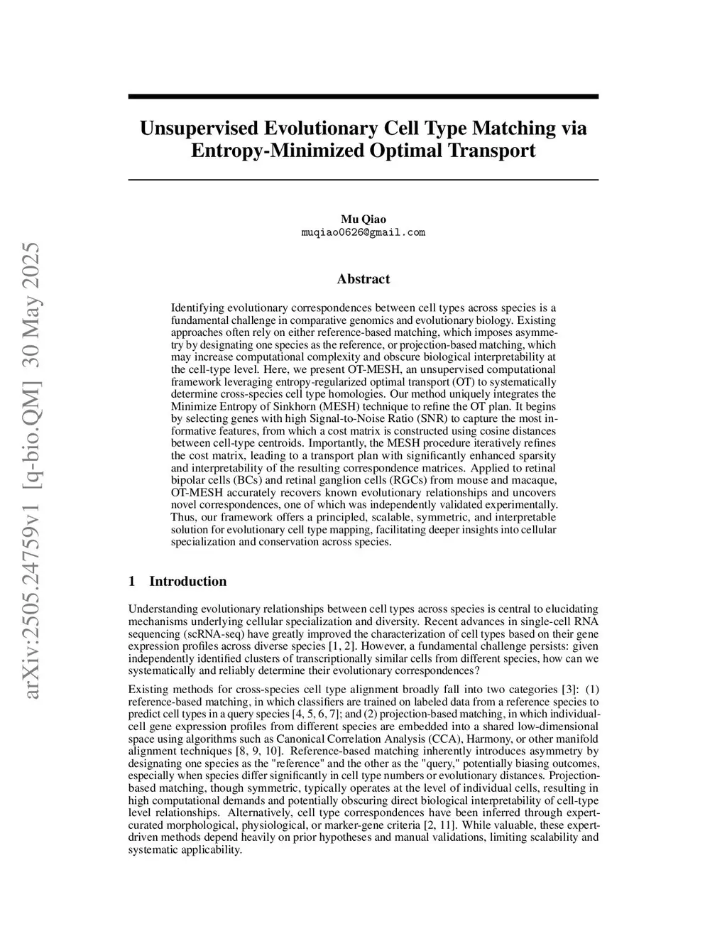 Identifying evolutionary correspondences between cell types across species is a fundamental challenge in comparative genomics and evolutionary biology. Existing approaches often rely on either reference-based matching, which imposes asymmetry by designating one species as the reference, or projection-based matching, which may increase computational complexity and obscure biological interpretability at the cell-type level. Here, we present OT-MESH, an unsupervised computational framework leveraging entropy-regularized optimal transport (OT) to systematically determine cross-species cell type homologies. Our method uniquely integrates the Minimize Entropy of Sinkhorn (MESH) technique to refine the OT plan, transforming diffuse transport matrices into sparse, interpretable correspondences. Through systematic evaluation on synthetic datasets, we demonstrate that OT-MESH achieves near-optimal matching accuracy with computational efficiency, while maintaining remarkable robustness to noise. Compared to other OT-based methods like RefCM, OT-MESH provides speedup while achieving comparable accuracy. Applied to retinal bipolar cells (BCs) and retinal ganglion cells (RGCs) from mouse and macaque, OT-MESH accurately recovers known evolutionary relationships and uncovers novel correspondences, one of which was independently validated experimentally. Thus, our framework offers a principled, scalable, and interpretable solution for evolutionary cell type mapping, facilitating deeper insights into cellular specialization and conservation across species.